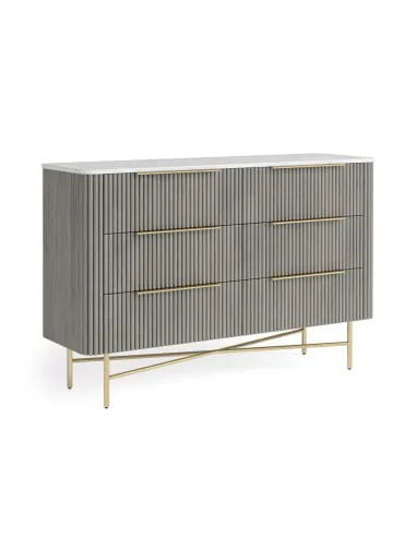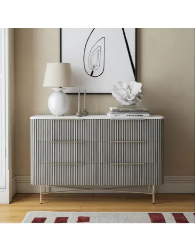 Reference: G7394The Lexington range features dynamic racetrack curves and distinctive ribbing that create a bold and stylish statement. The solid mango charcoal finish is harmoniously contrasted with multiple finishes, while the natural marble top adds an elegant touch. The grey-finished base with round legs complements the rounded silhouette, offering both sophistication and stability. The seamlessly integrated doors provide easy access to inner storage with convenient shelves, making it both functional and visually striking.