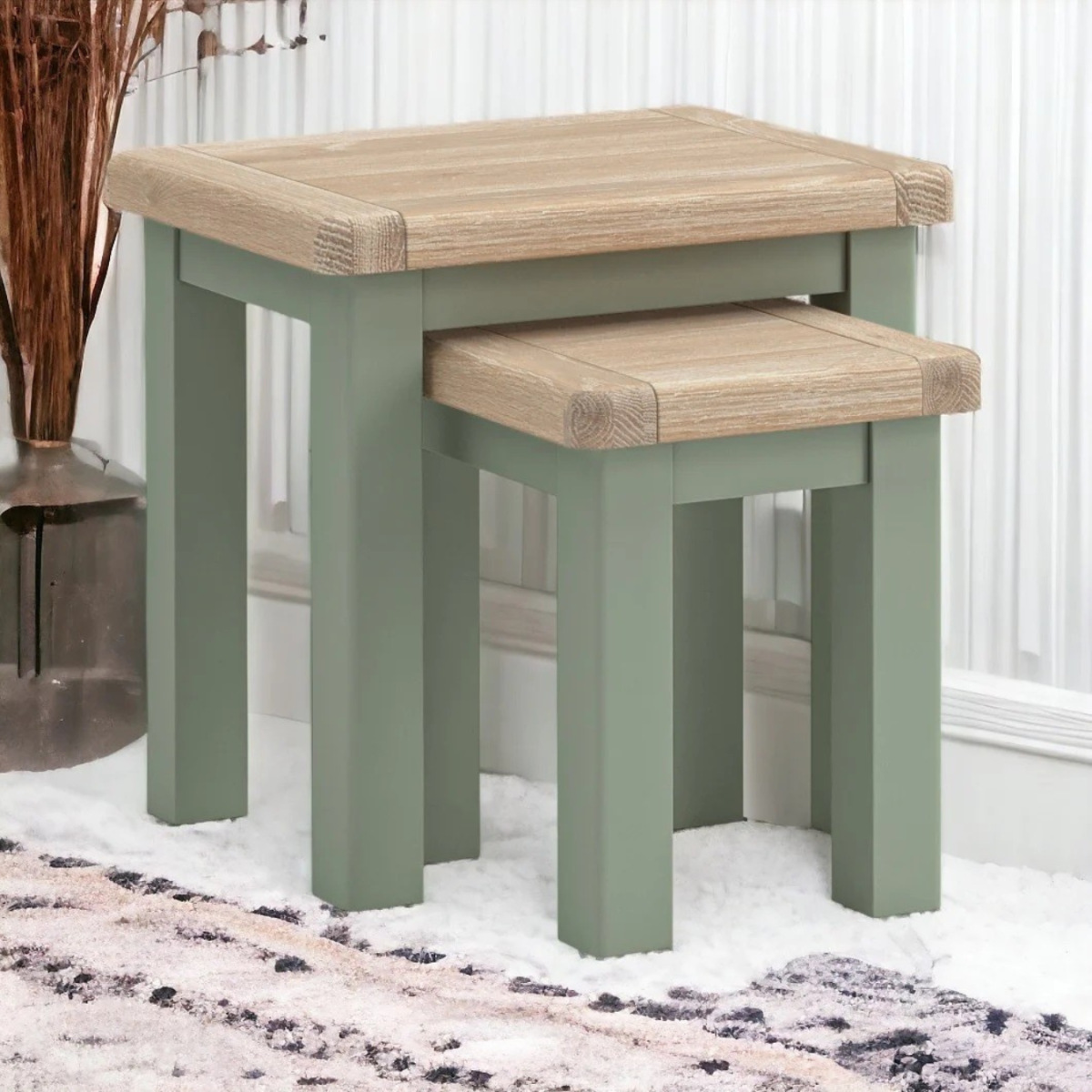 Reference: G8373Blending traditional charm with contemporary elegance, this Marbury nest of two tables in soft Sage adds a stylish and practical touch to any home. The beautifully crafted white-washed oak tops feature a smooth oil finish, bringing warmth and character to both modern and classic interiors. With chunky legs and a sturdy build, this set is designed for both durability and everyday functionality. Whether used separately or nested together to save space, these tables offer a perfect balance of style and practicality.