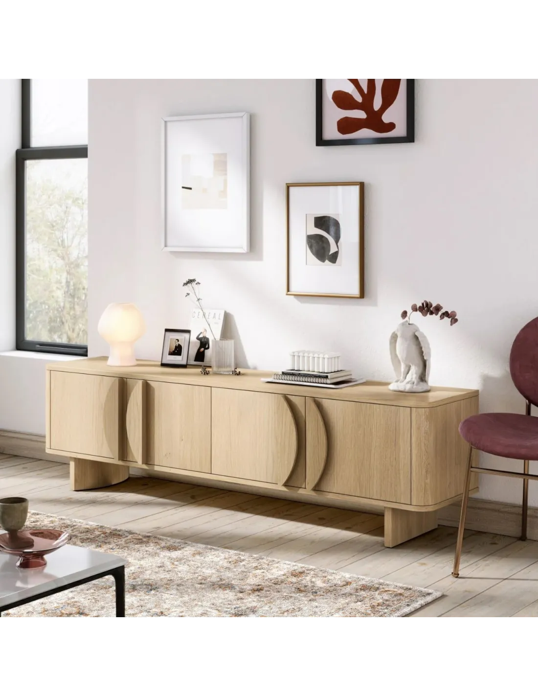 Reference: G8434The Candy range brings a touch of elegance to any room with its striking half-moon accents and overscale proportions. Featuring soft, subtle semi-circle shaping and a fresh light oak finish, this collection adds a charming and sophisticated look to your space. With 2 media units, 2 sideboards, and 2 dining tables, the Candy range offers versatile options to suit your needs. A contemporary design with Art Deco influences, the collection features arc handles that evoke timeless sophistication. Built with reassuringly heavy construction and soft-closing doors, it offers both style and functionality.