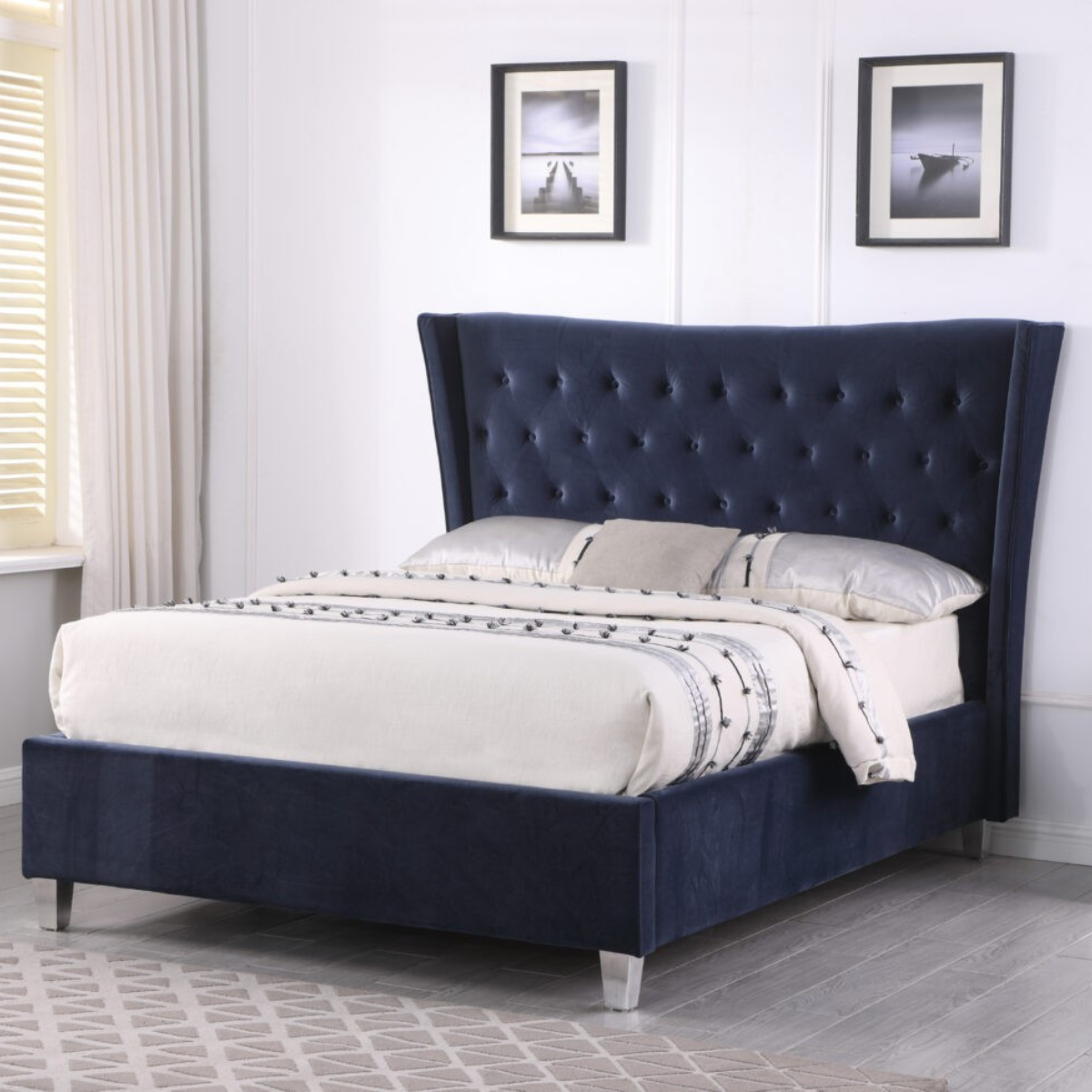 Reference: Kendricknavy46The Hanne Glam Bedframe is a striking blend of elegance and durability, perfect for modern bedroom interiors. Built with a solid hardwood frame, it offers long-lasting support while showcasing luxurious velvet upholstery in your choice of navy or mink. The sophisticated winged headboard features beautiful buttoned detailing, creating a timeless focal point. A low foot end enhances the feeling of space, while dark wood feet provide a refined finish. The wooden slatted base ensures traditional, reliable mattress support for added comfort.