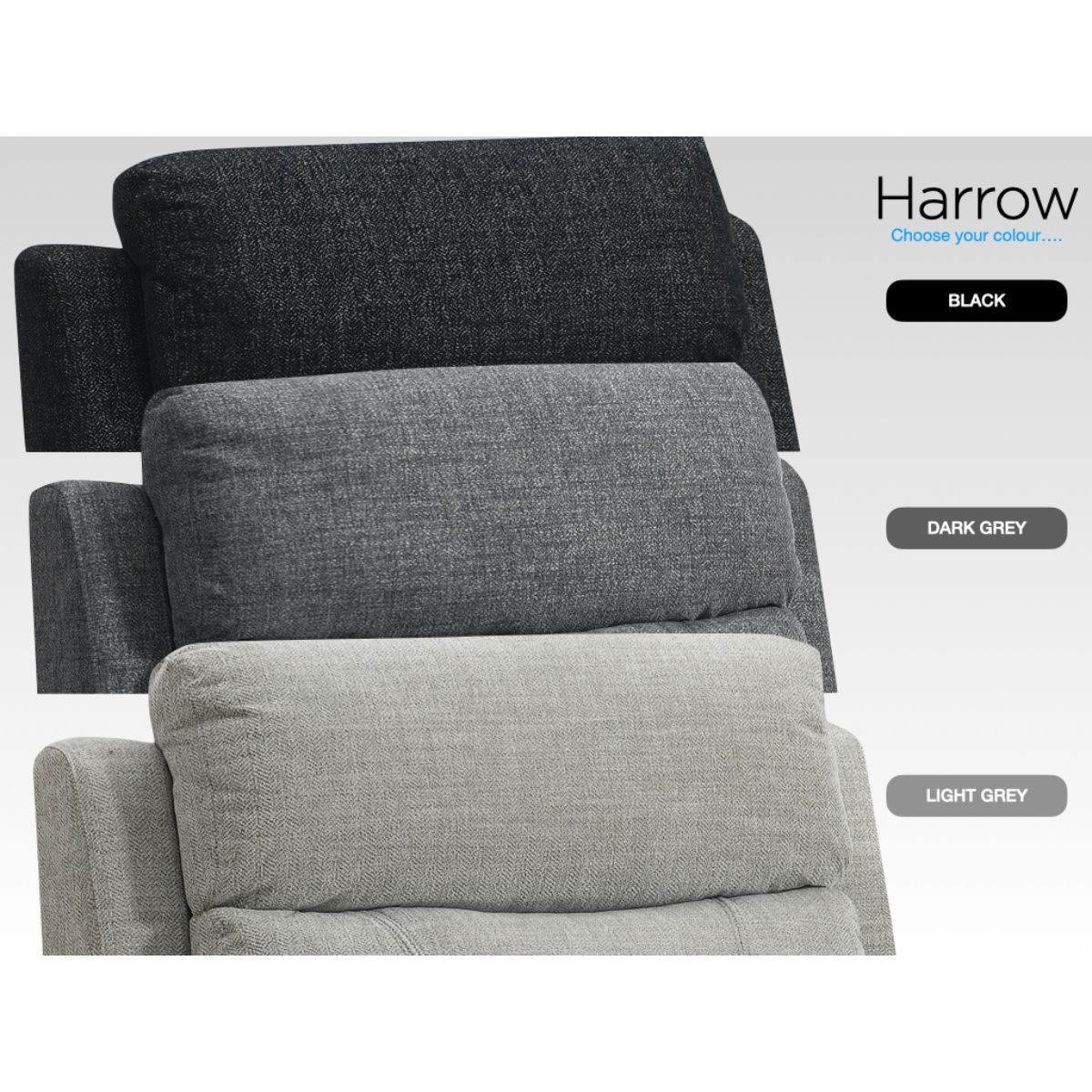 Reference: 16835Introducing the Harrow Electric Reclining Range, where modern design meets ultimate comfort. Available in three stylish colours — Dark Grey, Light Grey, and Black — each piece is upholstered in luxurious fabric with a subtle speckled texture, adding depth and contemporary charm to your space.