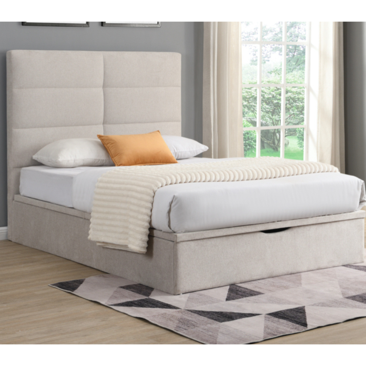 Reference: 15684The Jessica gas lift storage bed offers understated elegance with a sleek and versatile design. Upholstered in a timeless Beige, its plain back design provides a minimalist aesthetic that suits both modern and classic interiors. Designed for practicality, the gas lift mechanism allows smooth access to the spacious under-bed storage, while the full platform base delivers excellent mattress support and lasting strength. Available in 5ft or 4ft6 sizes, the Jessica bedframe is a smart choice for stylish comfort and functionality.