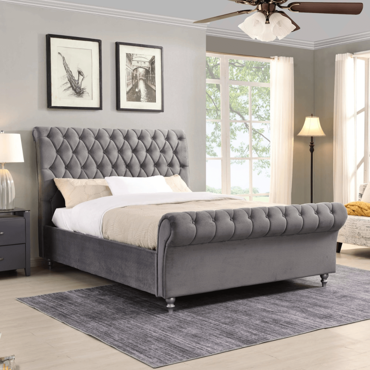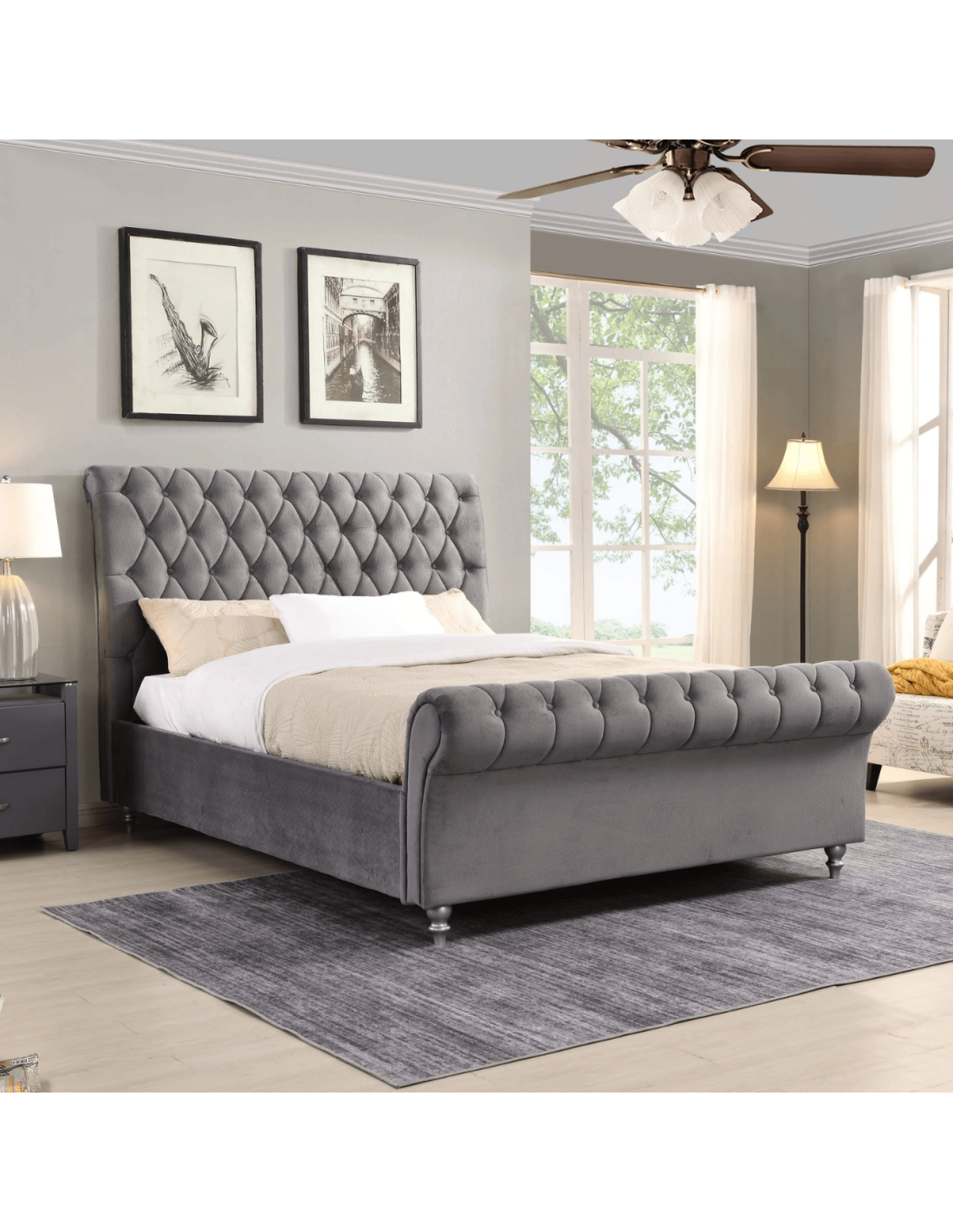 Reference: KILKENNYGREYBED-5FTAdd a touch of regal elegance to your bedroom with the Kilkenny traditional bedframe. Draped in luxurious velvet, this bed combines classic design with modern sophistication. The diamond-patterned headboard creates a striking focal point, while the button-back details on both the headboard and footboard add depth and texture. The sturdy silver-stained wooden feet offer strong support and complete the luxurious look, making this bed the perfect centerpiece for any bedroom.