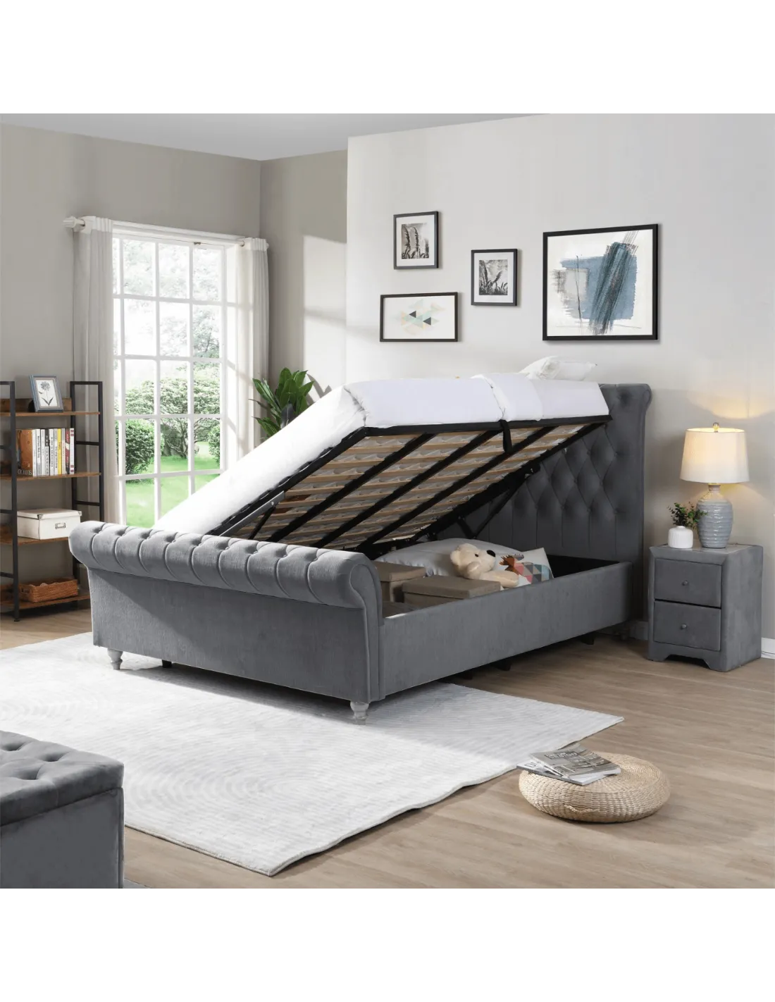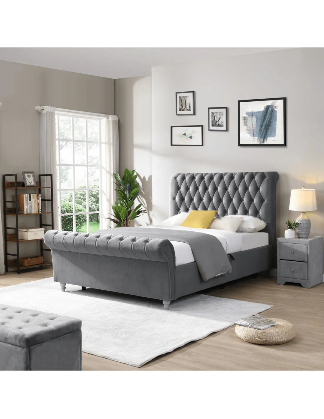 Reference: Kilkenny Grey Side Gas-Lift Bed 5ftExperience the Kilkenny Gas-lift bed—a regal embodiment of luxury and sophistication that transforms your bedroom. This bed is enveloped in opulent velvet, offering a stylish retreat. It's not just a place to rest; it's an invitation to indulge in the lap of luxury. The grey scrolled bed features meticulous button-back detail on both the headboard and footboard, turning it into a work of art. The headboard's intricate diamond pattern adds depth and character to your bedroom, capturing attention like a mesmerizing piece of art. The bed stands on four sturdy grey-stained wooden feet that ensure restful slumber while adding a touch of style. What sets the Kilkenny bed apart is its gas-lift feature for additional storage, a practical touch that enhances your bedroom's functionality. The Kilkenny traditional bed is a sanctuary of luxury and design, elevating your room to a haven of sophistication and character.