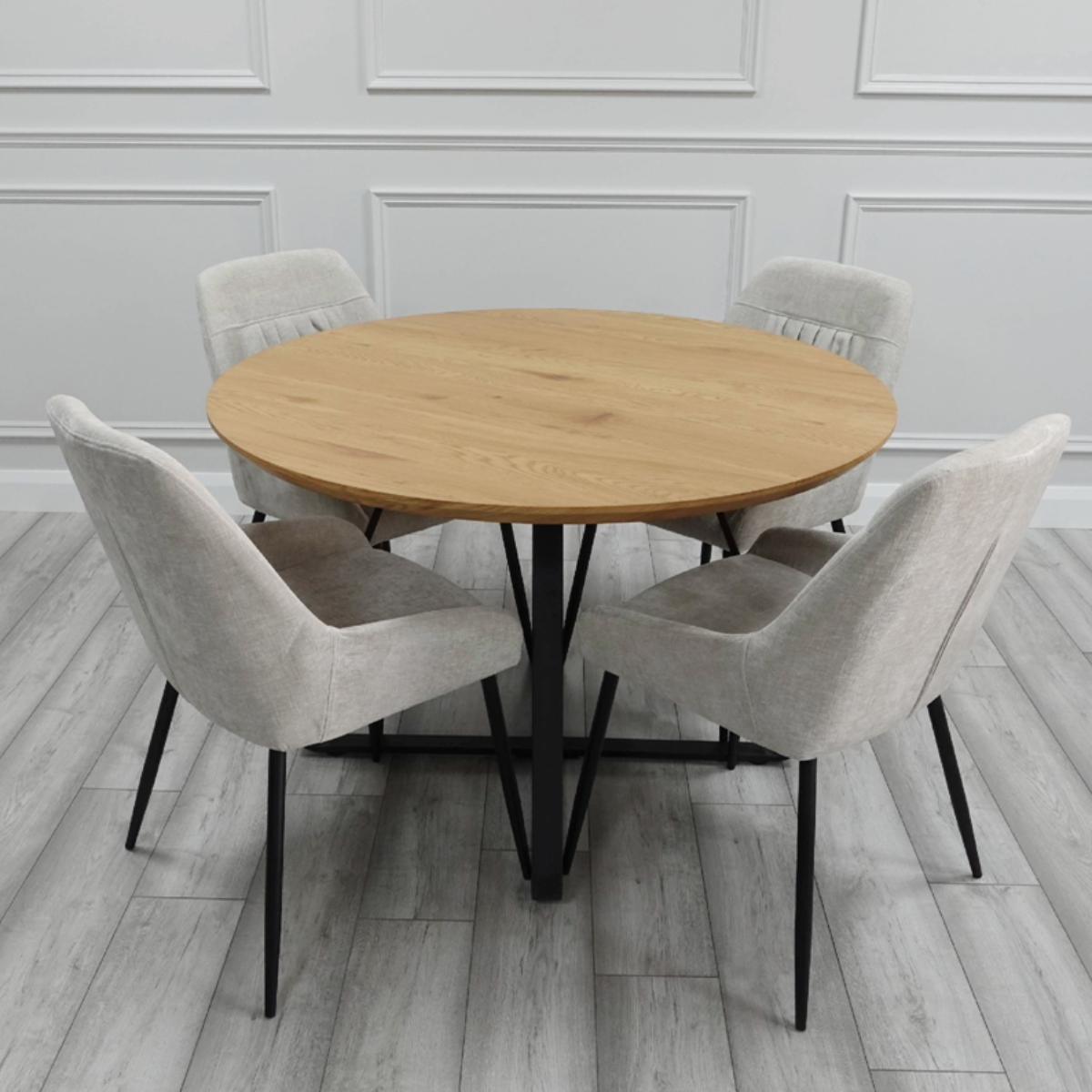 Reference: Windsordiningset4stoneThe Lanphear dining set combines modern elegance with timeless craftsmanship. Featuring a sturdy oak top with sleek black legs, the table offers a stylish contrast that suits both contemporary and classic interiors. The accompanying chairs are upholstered in a soft stone fabric, providing both comfort and sophistication, while their black legs complement the table’s design. This set is perfect for bringing warmth and character to any dining space.