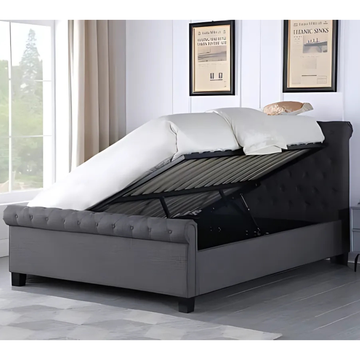 Reference: SET-PARISGREY46Bring timeless elegance and smart functionality to your bedroom with the Layla Gas Lift Bed. Upholstered in soft grey linen, this bed features a deeply buttoned headboard and footboard with a classic scroll design, adding a luxurious touch to any contemporary or traditional décor. The smooth upholstered sides and solid dark wood feet enhance its sophisticated look. More than just a statement piece, the Layla bed includes a gas lift mechanism that reveals generous under-bed storage—perfect for tucking away bedding, clothes, or seasonal items. It’s a practical solution that doesn’t compromise on style.
