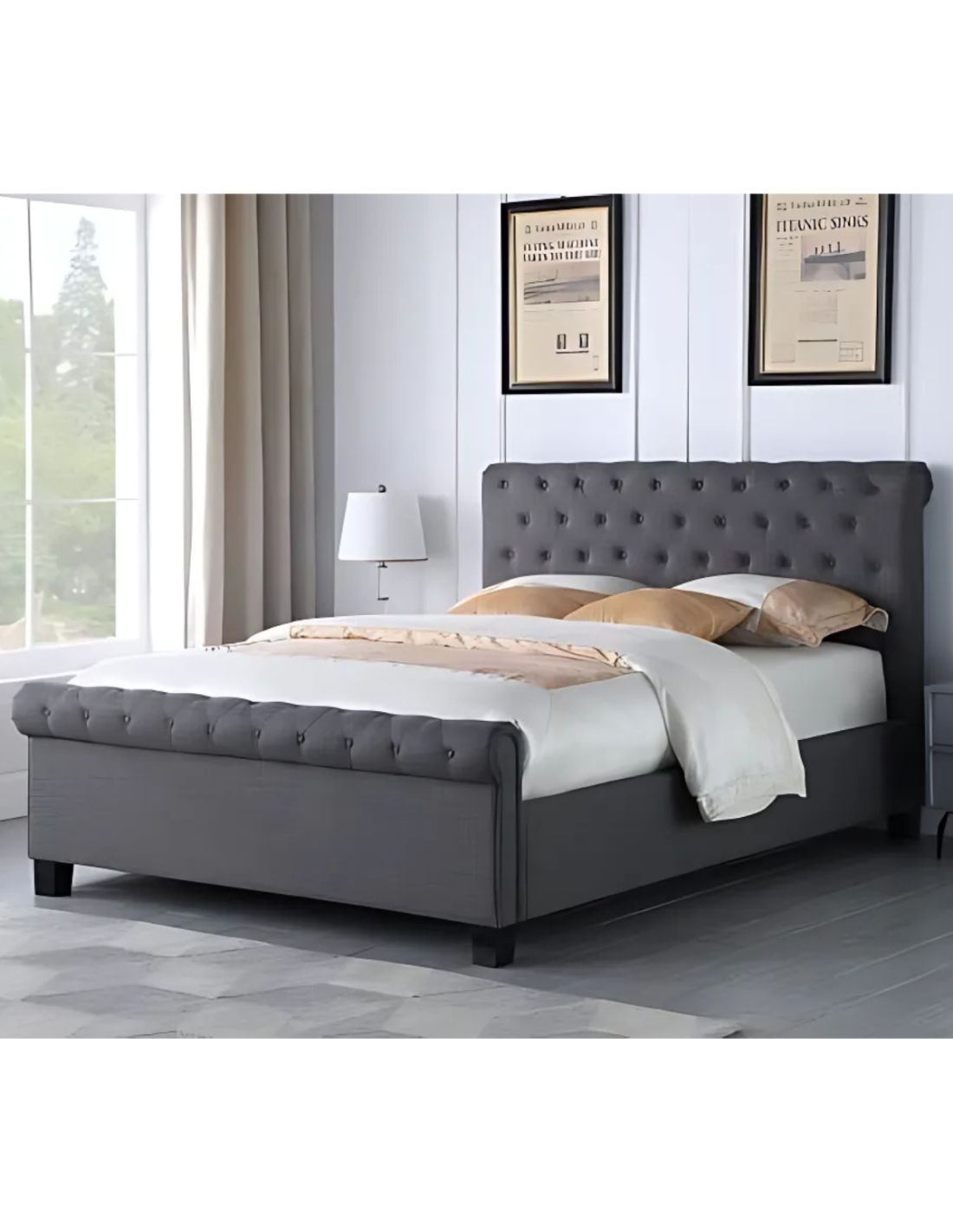 Reference: Parisgasliftgrey50Bring timeless elegance and smart functionality to your bedroom with the Layla Gas Lift Bed. Upholstered in soft grey linen, this bed features a deeply buttoned headboard and footboard with a classic scroll design, adding a luxurious touch to any contemporary or traditional décor. The smooth upholstered sides and solid dark wood feet enhance its sophisticated look. More than just a statement piece, the Layla bed includes a gas lift mechanism that reveals generous under-bed storage—perfect for tucking away bedding, clothes, or seasonal items. It’s a practical solution that doesn’t compromise on style.