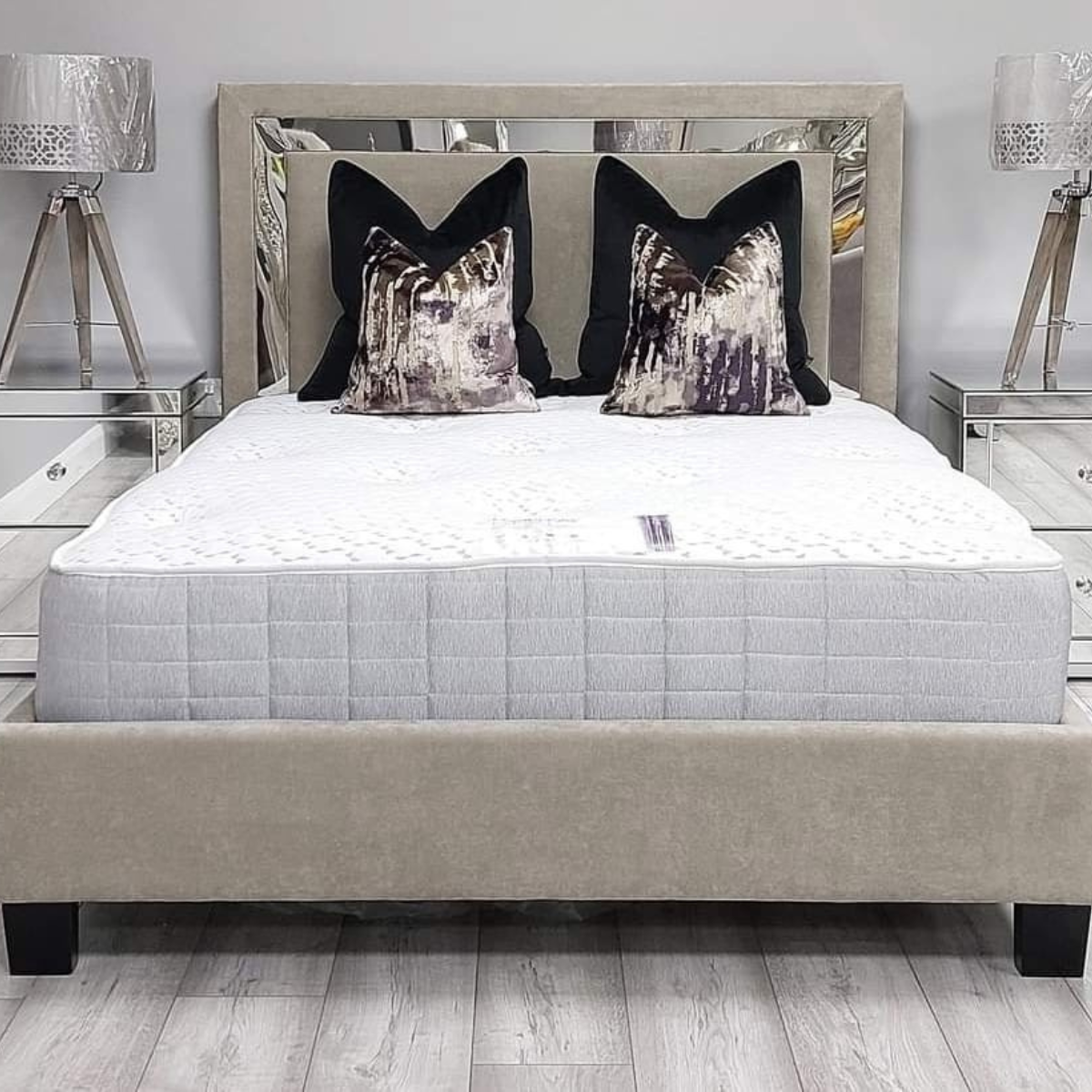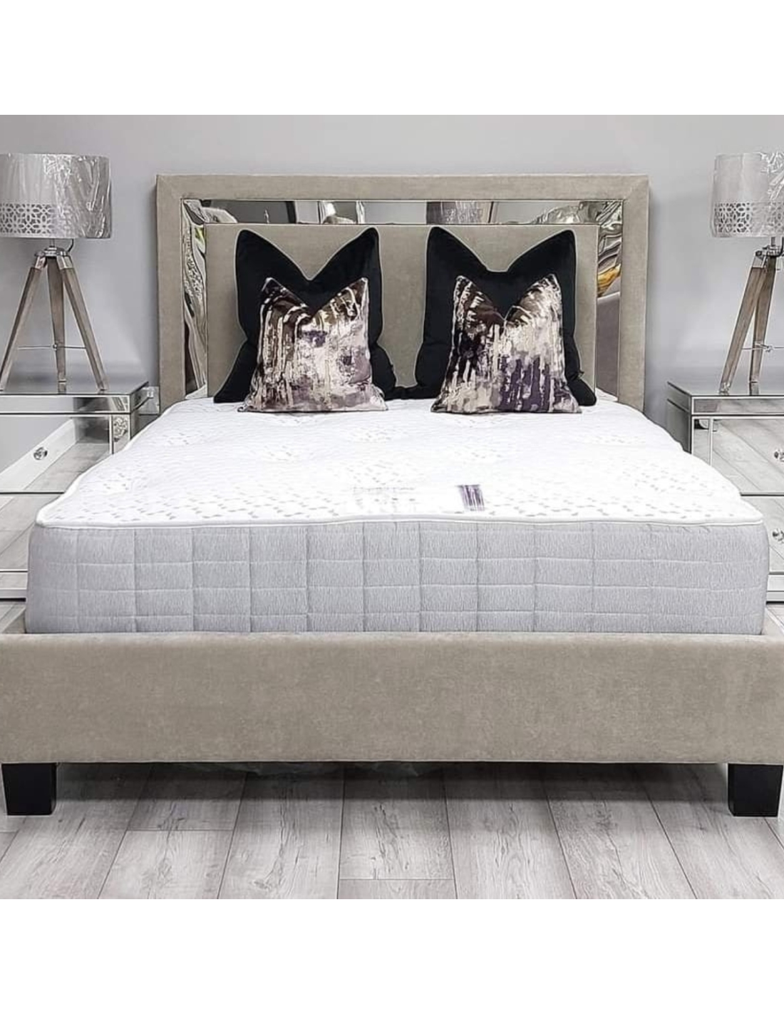 Reference: Camillamick46The Lila Bedframe brings contemporary elegance to your bedroom with its sleek design and luxurious finish. Constructed from solid materials, it ensures long-lasting durability and a stable foundation. Upholstered in plush velvet fabric in a soft, neutral tone, it creates a calm and sophisticated atmosphere. The headboard is enhanced with striking mirrored detailing, adding a touch of glamour and reflecting light to brighten the space. A perfect modern centerpiece, the Lila bed combines beauty and practicality for a refined bedroom setting.