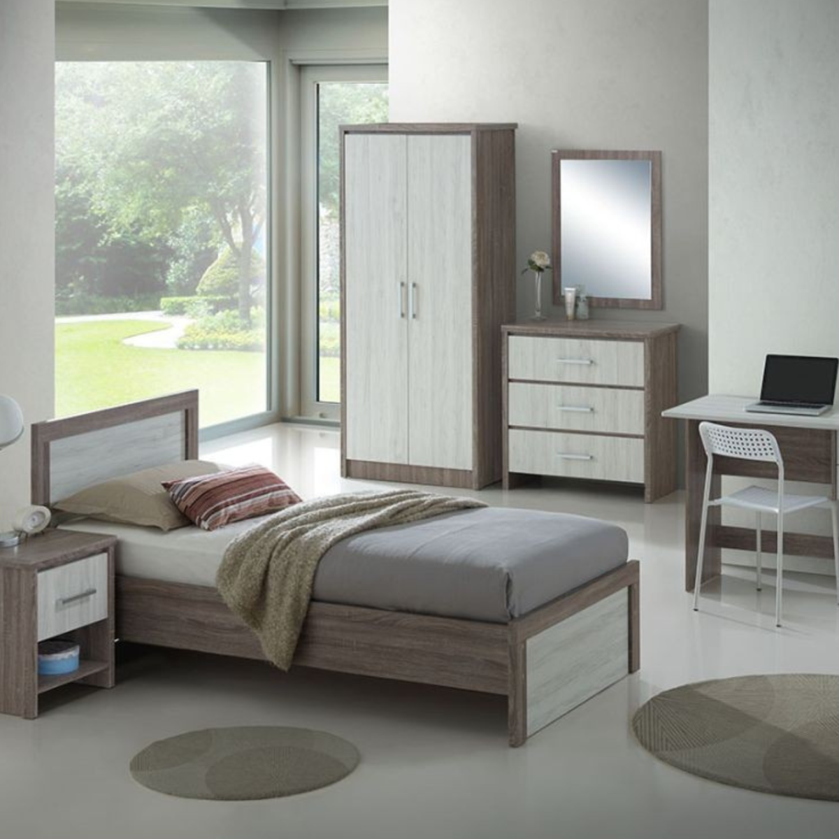Reference: LUCYB3The Lucy 3FT bed is a standout piece within the Lucy bedroom range, designed to complement its clean, contemporary aesthetic. With its modern straight lines and contrasting Sonoma oak and grey oak finish, the bed frame brings a fresh and stylish look to any child's or guest bedroom. The sturdy construction ensures lasting durability, while the low-profile footboard and headboard enhance the streamlined silhouette. Chrome-accented detailing adds a refined finishing touch. The 3FT size is ideal for single sleepers, making it a perfect choice for smaller rooms without compromising on style.
