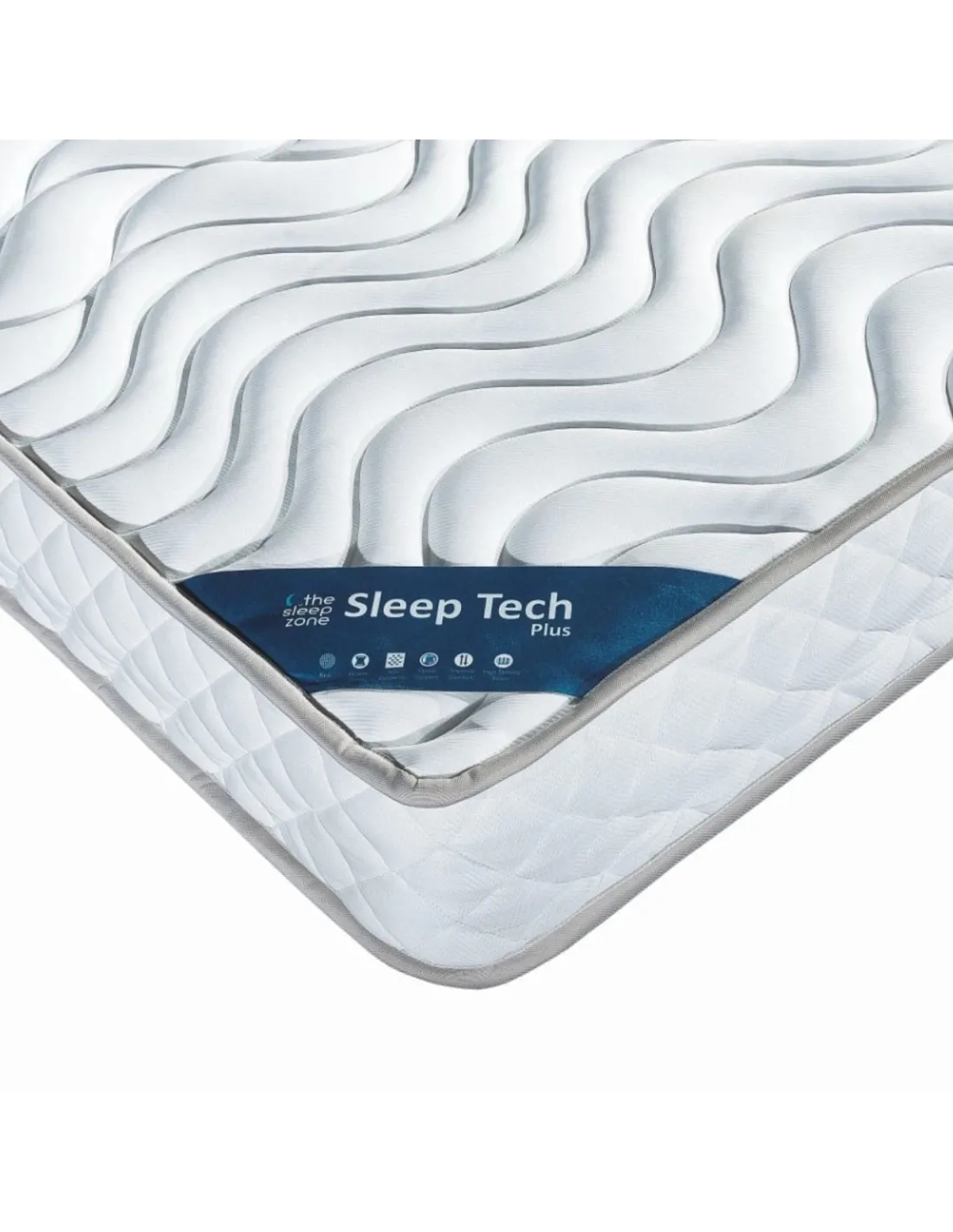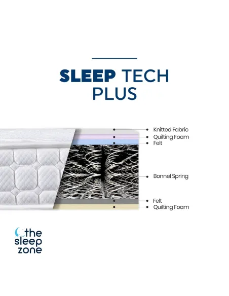 Reference: MDSTP46The Sleep Zone Sleep Tech Plus mattress is designed to offer enhanced support and comfort without stretching your budget. Featuring 9-inch Bonnell springs, slightly thicker than those in the standard Sleep Tech mattress, this mattress provides improved support, making it an ideal choice for those seeking quality and affordability. Crafted with carefully selected layers, the Sleep Tech Plus ensures a balanced, medium/firm feel for a restful night's sleep.