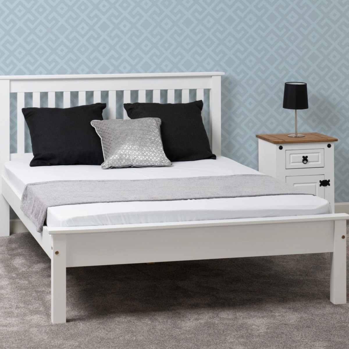 - Slatted headboard and low foot end design
