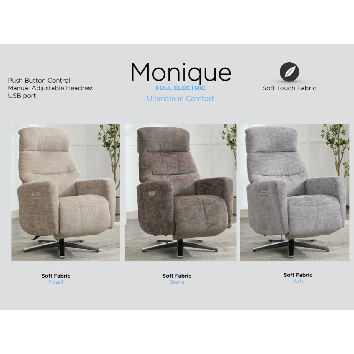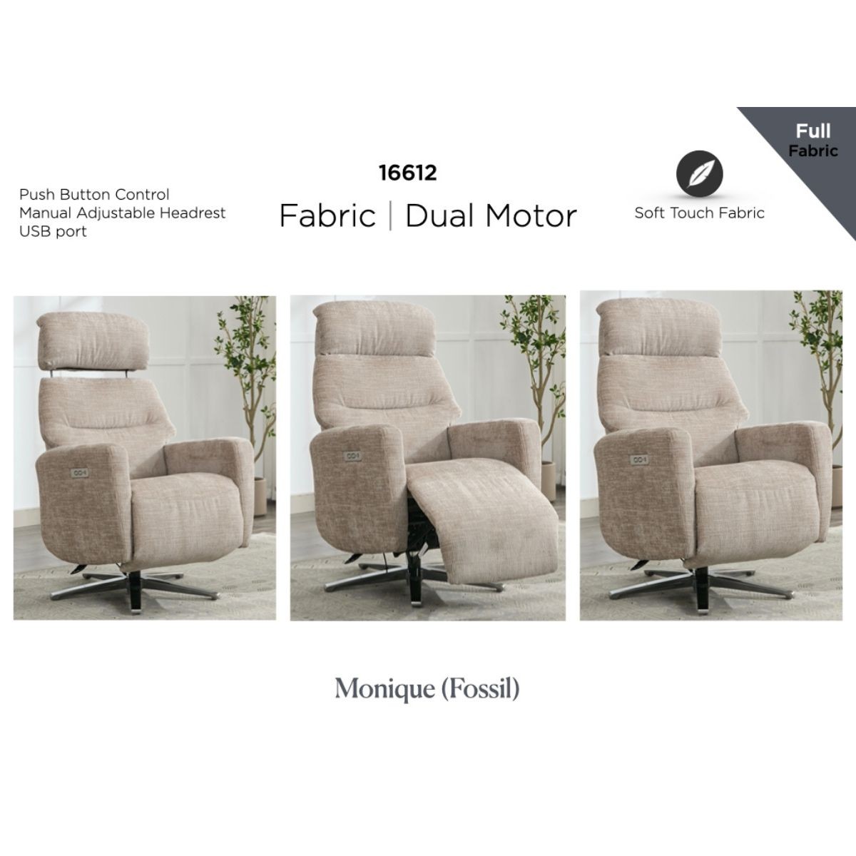 Reference: 16612Elevate your comfort with the Monique Electric TV Chair, designed to combine modern functionality with timeless style. Upholstered in elegant fabric shades of Fossil, Stone, or Ash, this chair enhances any living space with its refined look. The dual motor system allows independent adjustment of the backrest and footrest, giving you complete control over your seating position. Featuring a manual adjustable headrest for personalised support and a built-in USB port for charging devices, the Monique offers both luxury and convenience.