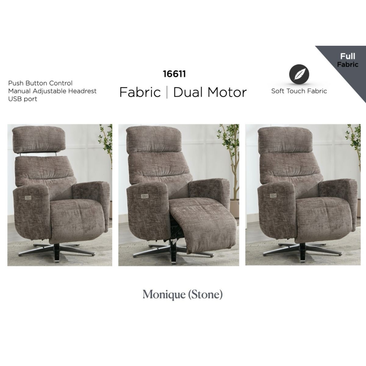 Reference: 16611Elevate your comfort with the Monique Electric TV Chair, designed to combine modern functionality with timeless style. Upholstered in elegant fabric shades of Fossil, Stone, or Ash, this chair enhances any living space with its refined look. The dual motor system allows independent adjustment of the backrest and footrest, giving you complete control over your seating position. Featuring a manual adjustable headrest for personalised support and a built-in USB port for charging devices, the Monique offers both luxury and convenience.