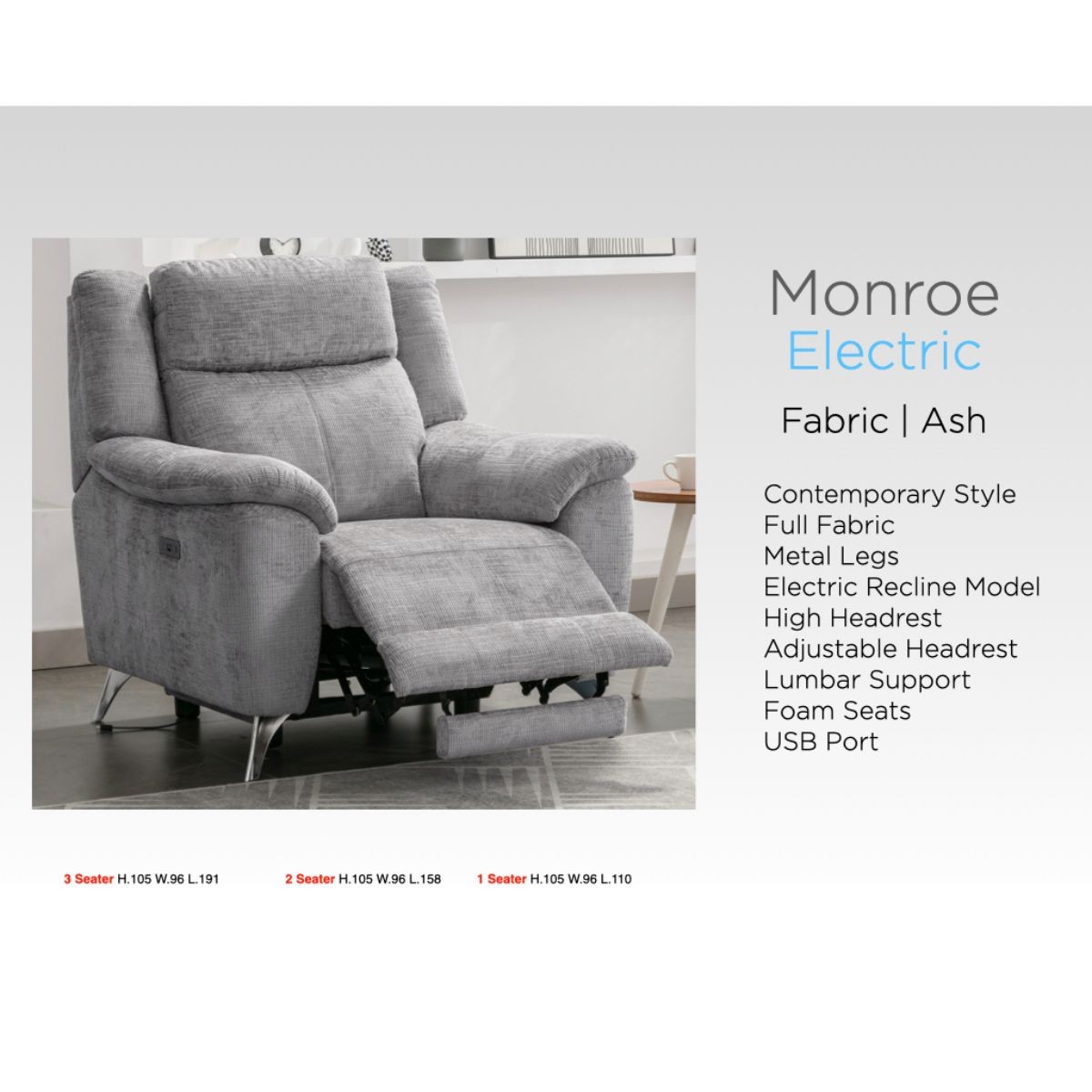 Reference: 16563Upgrade your living space and elevate your comfort with the Monroe Electric Reclining Suite and Fixed Suite options — the perfect fusion of style, innovation, and relaxation. Available in two luxurious fabric finishes, Fossil and Stone, this suite includes a 3-seater, 2-seater, and armchair, all designed to complement modern interiors.