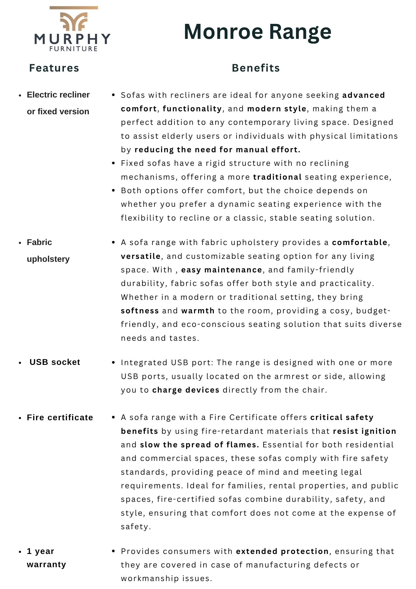 Upgrade your living space and elevate your relaxation with our Monroe electric reclining suite and fixed suite options. Discover the perfect fusion of style, comfort and innovation today. Available in two fabric colourways, fossil and stone in a 3 seater, 2 seater and armchair, the Monroe range offers a high adjustable headrest on the electric version and allows the user to control the recline function at the touch of a button. A built in USB charger is included as standard.