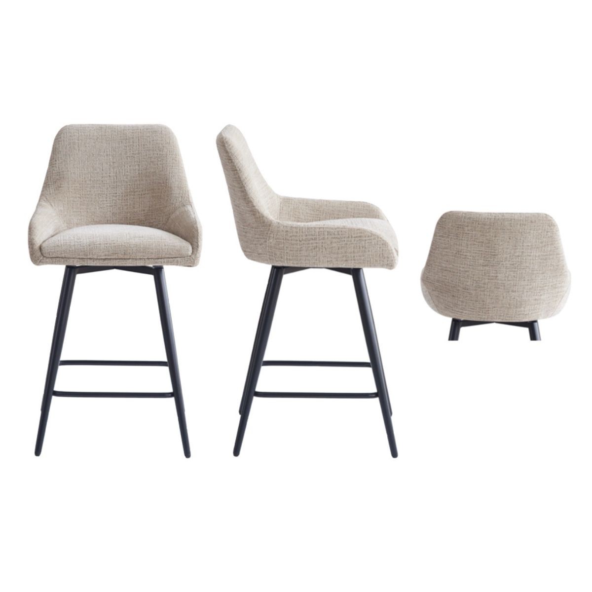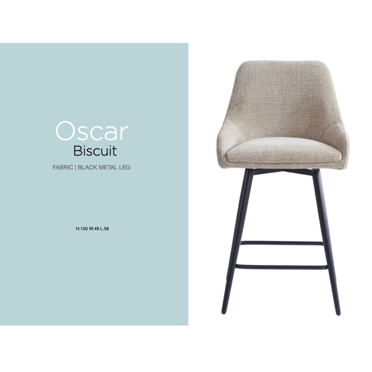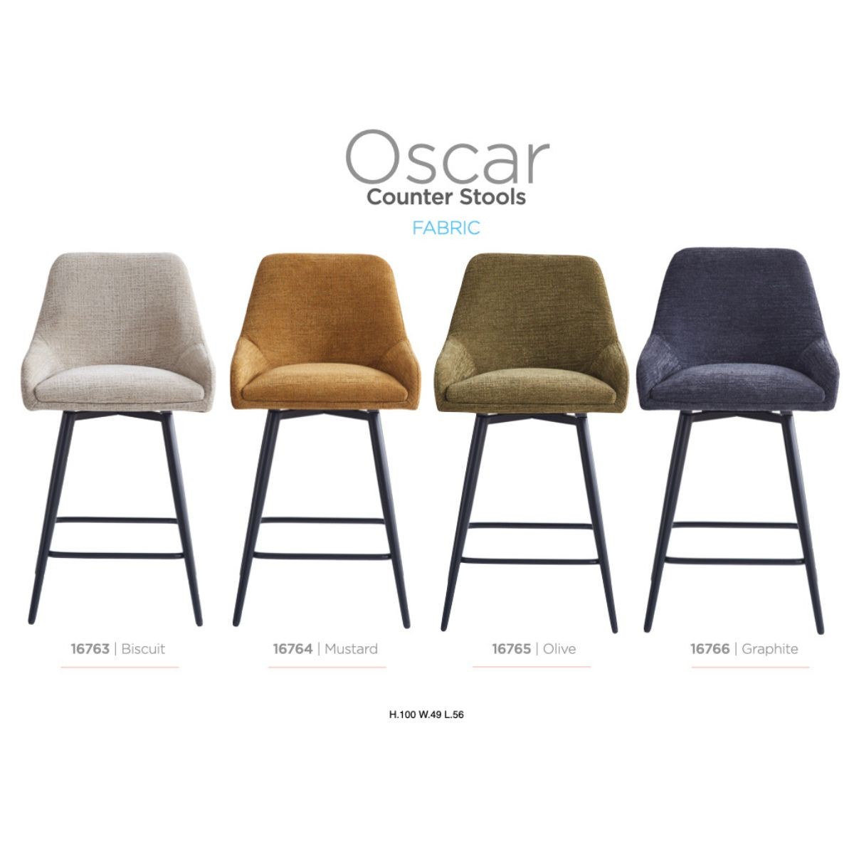 Reference: 16763The Oscar collection combines minimalist design with contemporary style, featuring fabric seats on sleek black metal legs. Available in biscuit, mustard, olive, and graphite, these stools and chairs add a modern touch to any dining or bar area.