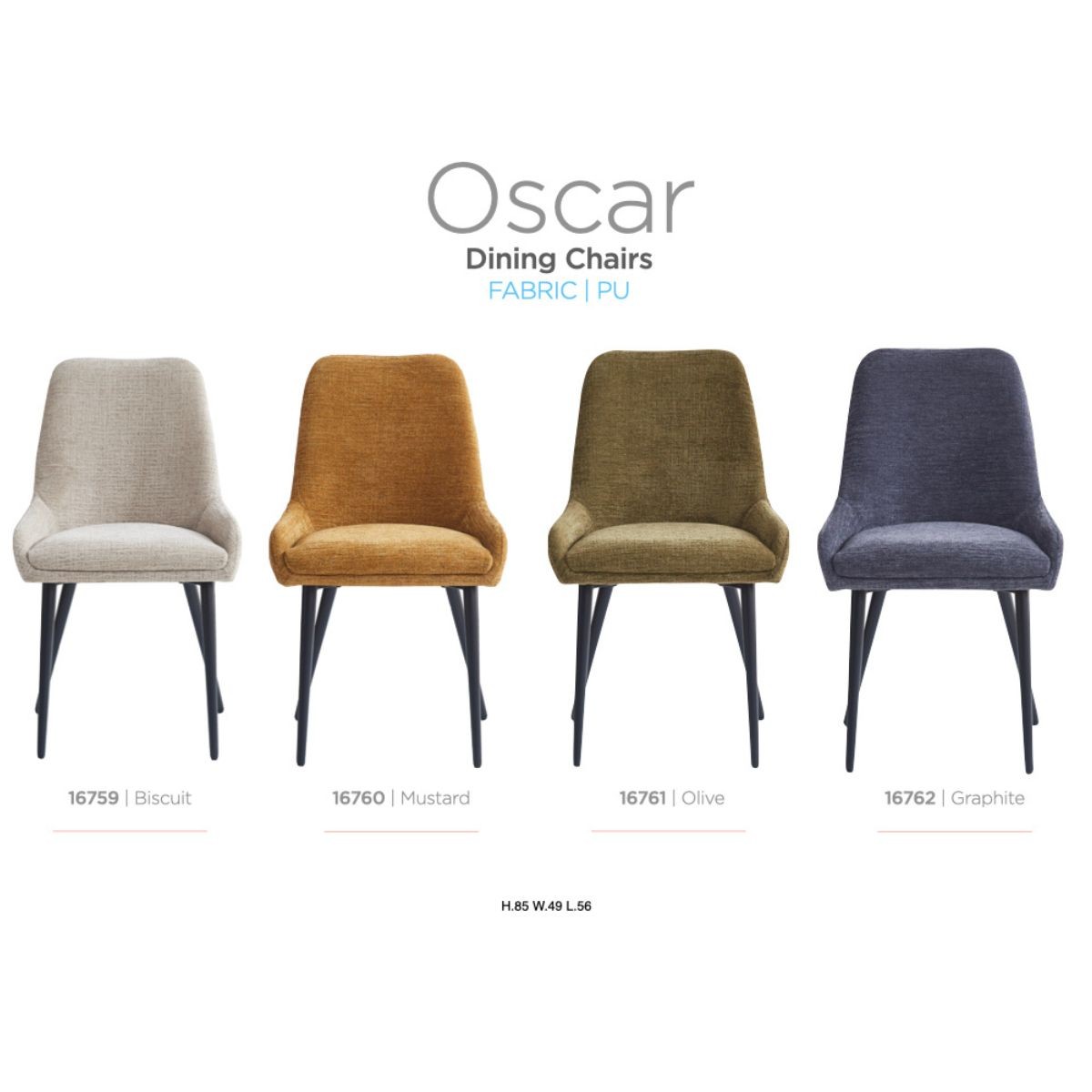 Reference: 16760The Oscar collection combines minimalist design with contemporary style, featuring fabric seats on sleek black metal legs. Available in biscuit, mustard, olive, and graphite, these stools and chairs add a modern touch to any dining or bar area.