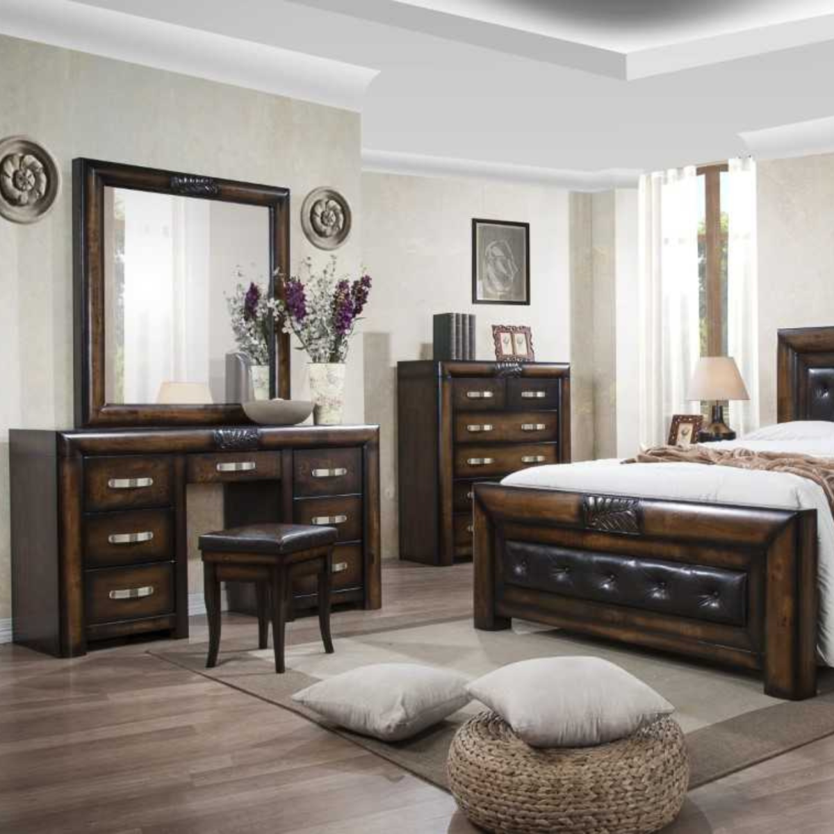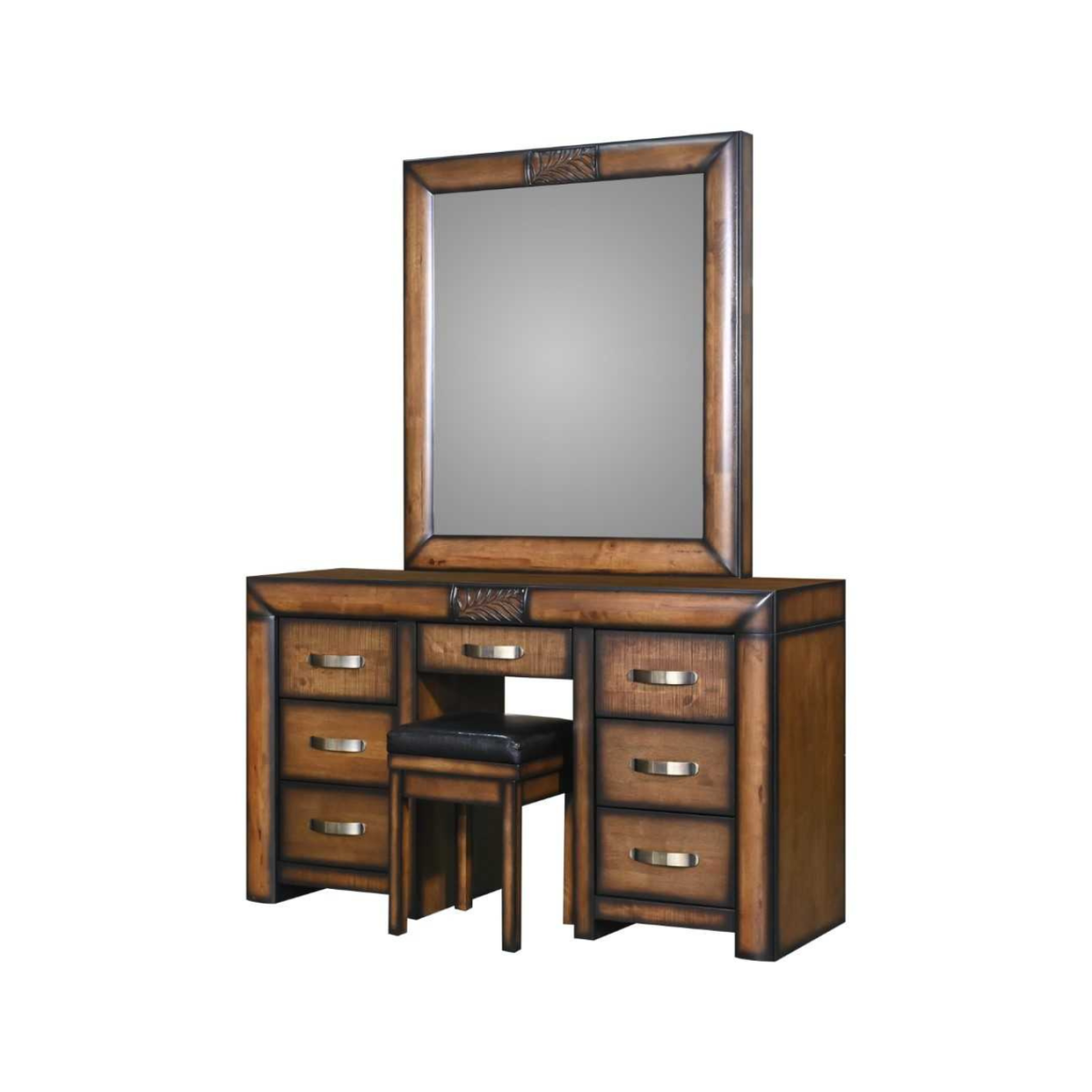 Reference: Paris Dressing TableIntroducing the Paris Dressing Table, crafted from solid rubberwood with a warm brown finish and dark-edged accents for rustic charm. This elegant piece includes three smooth-gliding drawers on each side and a central drawer, all fitted with sleek curved metal handles. The set comes with a matching stool featuring a leather cushion and a coordinating ornate mirror framed in rubberwood with a carved leaf motif, creating a stylish and functional centerpiece for any bedroom.