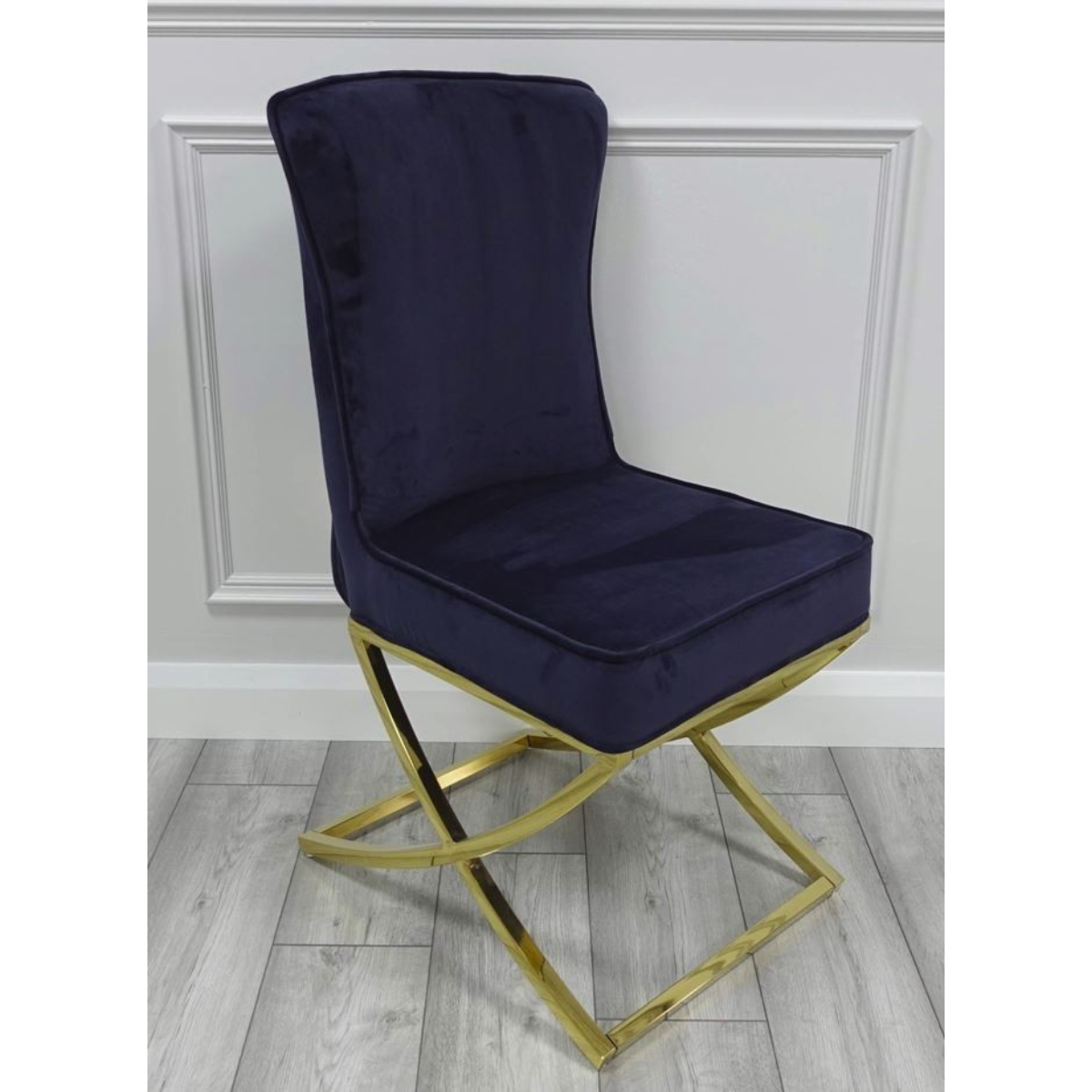 Reference: emmadiningchairnavyThe Pierre Dining Chair Range brings modern luxury into your home. Upholstered in plush, soft-touch fabric, these chairs offer outstanding comfort while making a stylish statement. The sleek, curved backrests and elegant gold X-shaped legs create a refined and contemporary look, perfect for enhancing any dining space with a touch of sophistication.