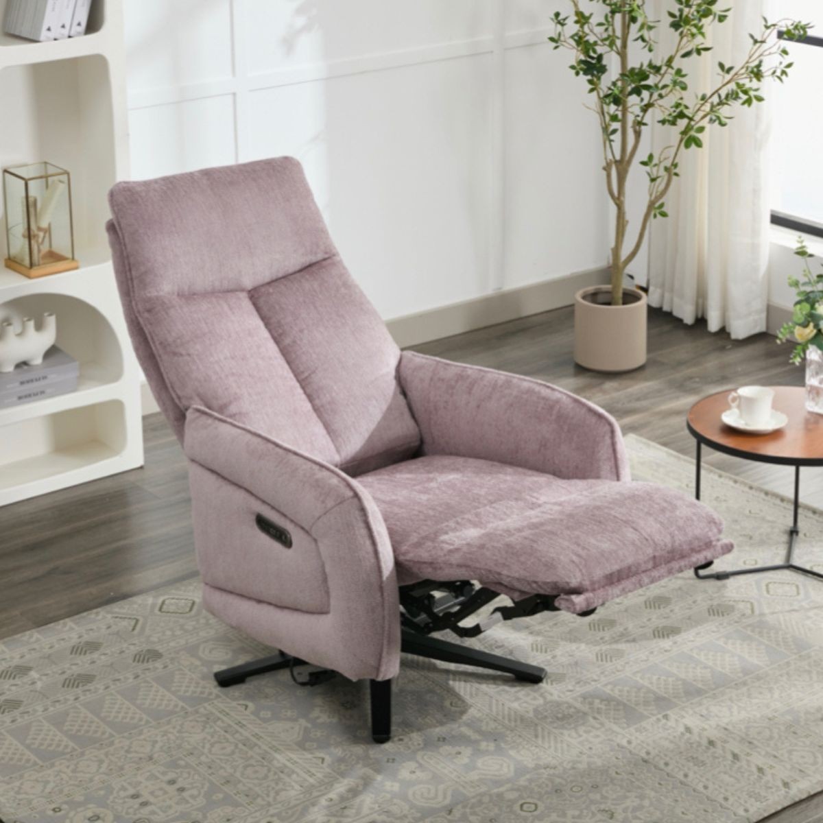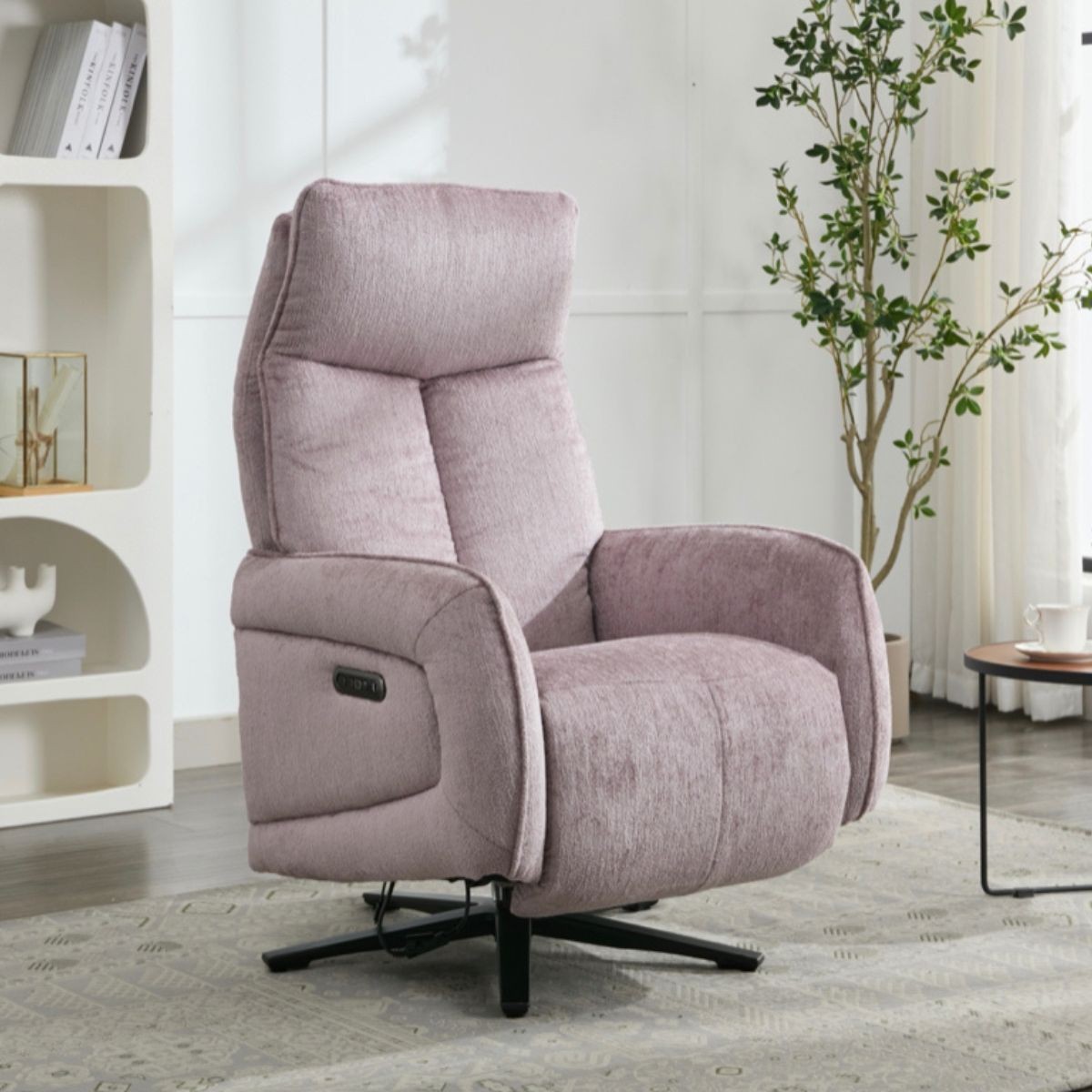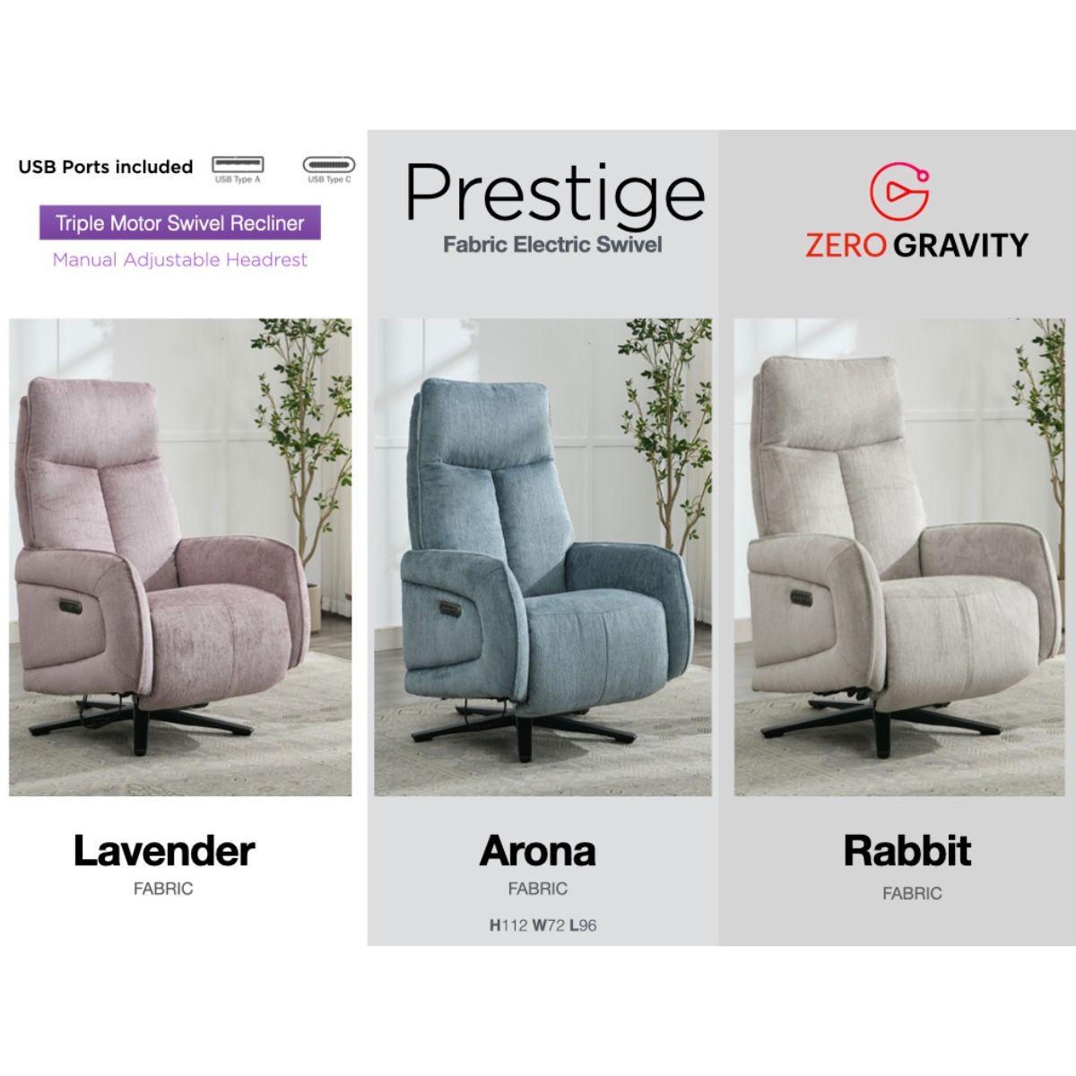 Reference: 16615Indulge in the luxury you deserve with the Prestige Electric Swivel Recliner Chair, where modern design meets advanced technology. Upholstered in luxurious fabric and available in three vibrant shades—Lavender, Arona, and Rabbit—this chair combines style, comfort, and functionality to perfection.
