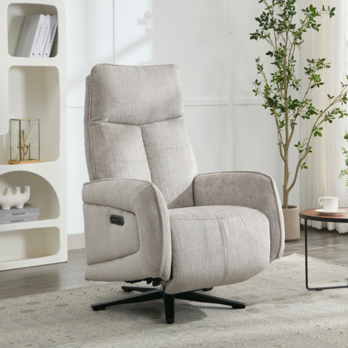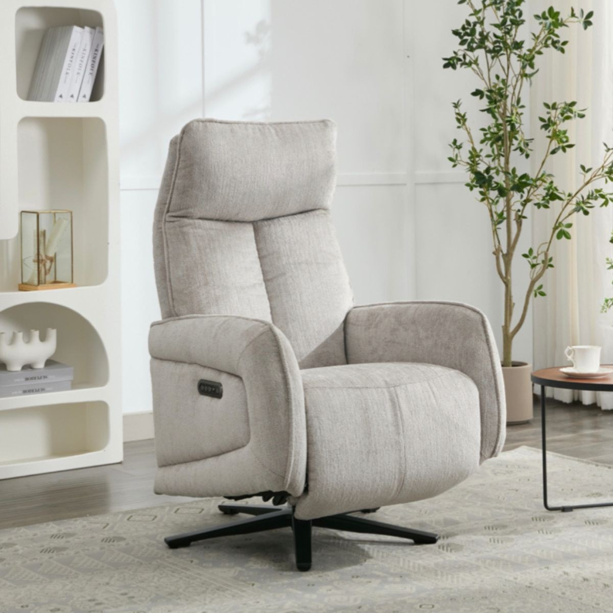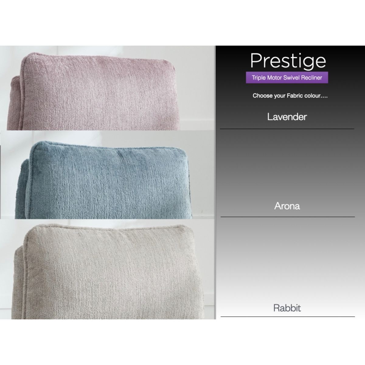 Reference: 16614Indulge in the luxury you deserve with the Prestige Electric Swivel Recliner Chair, where modern design meets advanced technology. Upholstered in luxurious fabric and available in three vibrant shades—Lavender, Arona, and Rabbit—this chair combines style, comfort, and functionality to perfection.