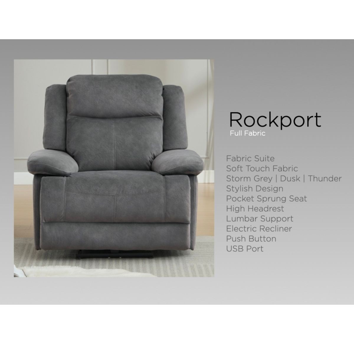 Reference: 16569Introducing the Rockport Electric Reclining Suite, available in luxurious Dusk, Storm, and Thunder soft-touch fabric finishes. This suite delivers the perfect balance of modern convenience and ultimate relaxation. With pocket-sprung seats for superior comfort and high headrests for excellent neck and head support, Rockport is built for both style and long-lasting durability. Effortlessly recline to your preferred position with the smooth electric mechanism, and keep your devices charged with the integrated USB port—making comfort and functionality beautifully seamless.
