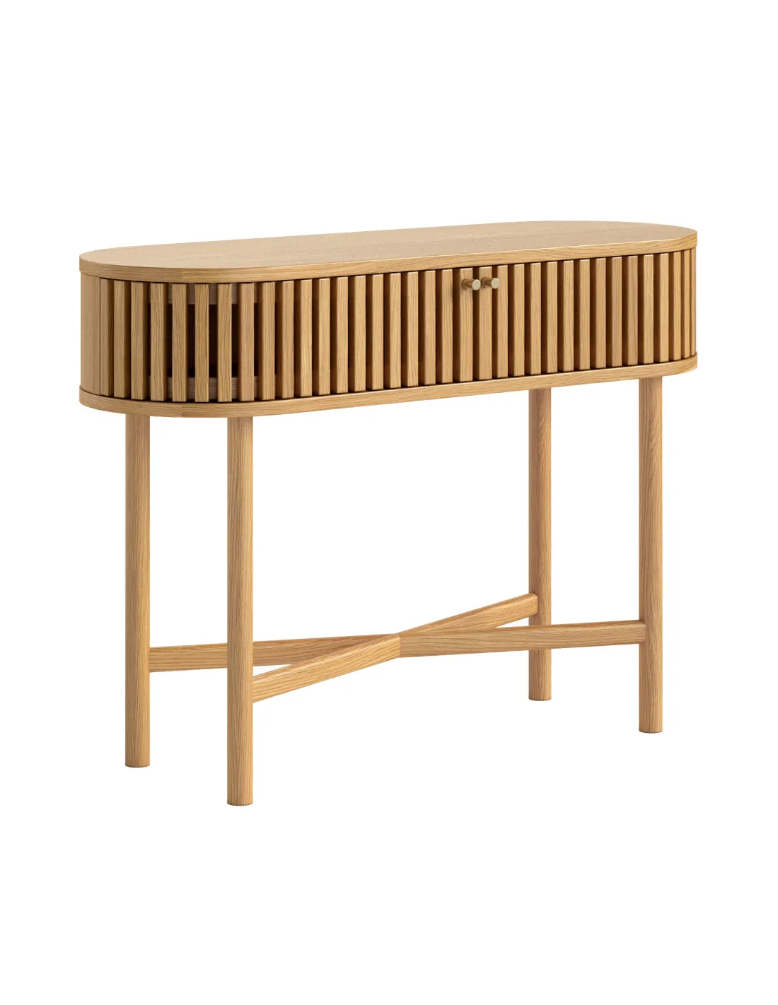 Reference: G9276A perfect balance of form and function, this Soho range features a sleek slatted front contrasted with gentle curved edges for a refined yet inviting look. The slatted door design adds lightness, texture, and a distinctive touch, ensuring it stands out in any living space. Elegant gold handles elevate the aesthetic, bringing warmth and sophistication while maintaining a minimalist, streamlined frame that complements modern interiors beautifully.