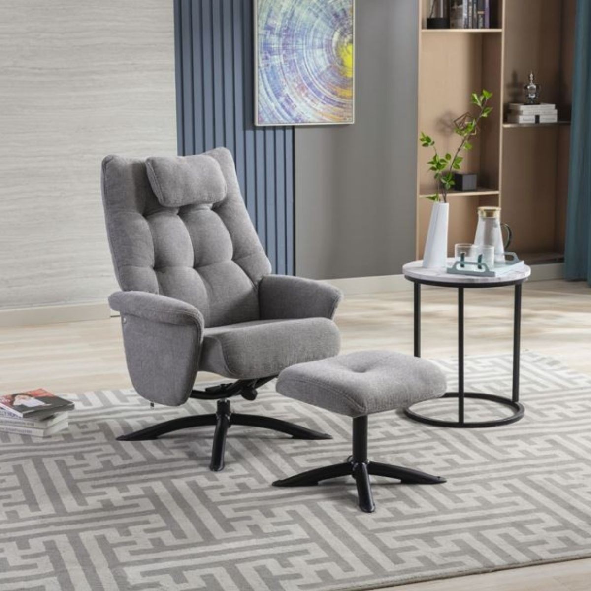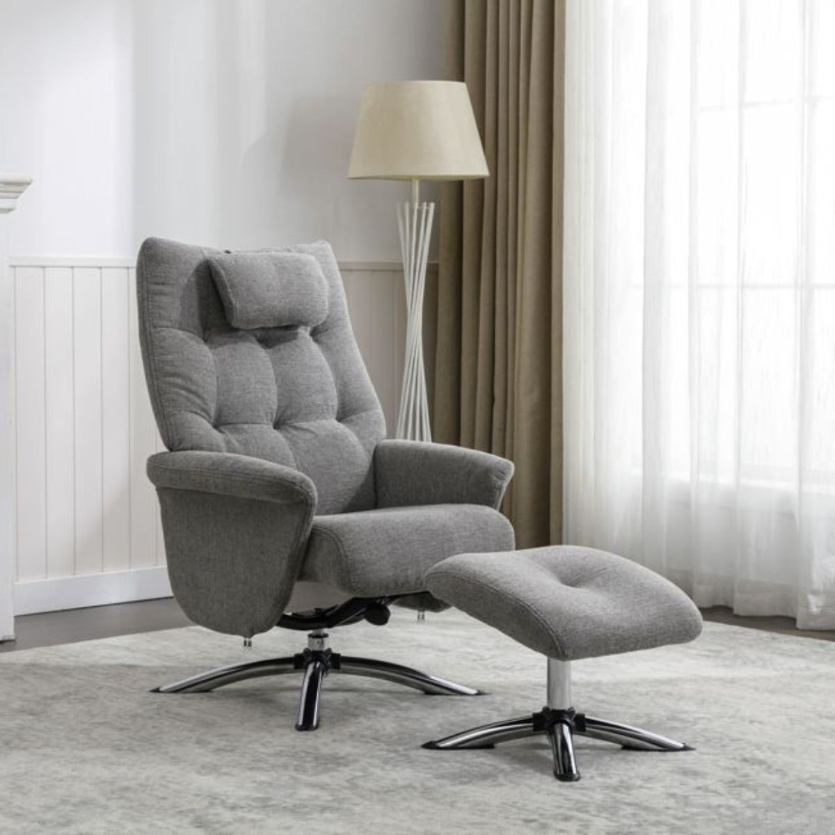 Reference: Orson1lightgreyThe Stoke Recliner Chair is designed to deliver ultimate relaxation and modern versatility. With effortless reclining positions and a smooth 360-degree swivel, you can unwind or adjust your view with ease. The supportive headrest and matching ottoman provide extra comfort, making the Stoke a stylish and practical addition to any cosy living space.