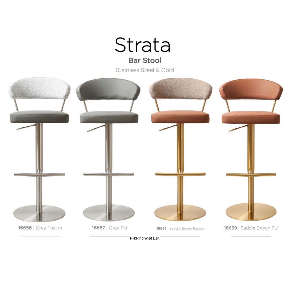 Reference: 16656Discover our Premium Bar Stool Collection – where modern design meets timeless sophistication. Crafted with a striking blend of brushed stainless steel and opulent gold finishes, these stools embody understated luxury. With a choice of PU leather or plush fabric upholstery, each stool offers the perfect balance of comfort and style. Featuring smooth gas-lift height adjustment and ergonomically contoured seating, this collection delivers everyday practicality wrapped in elegance.