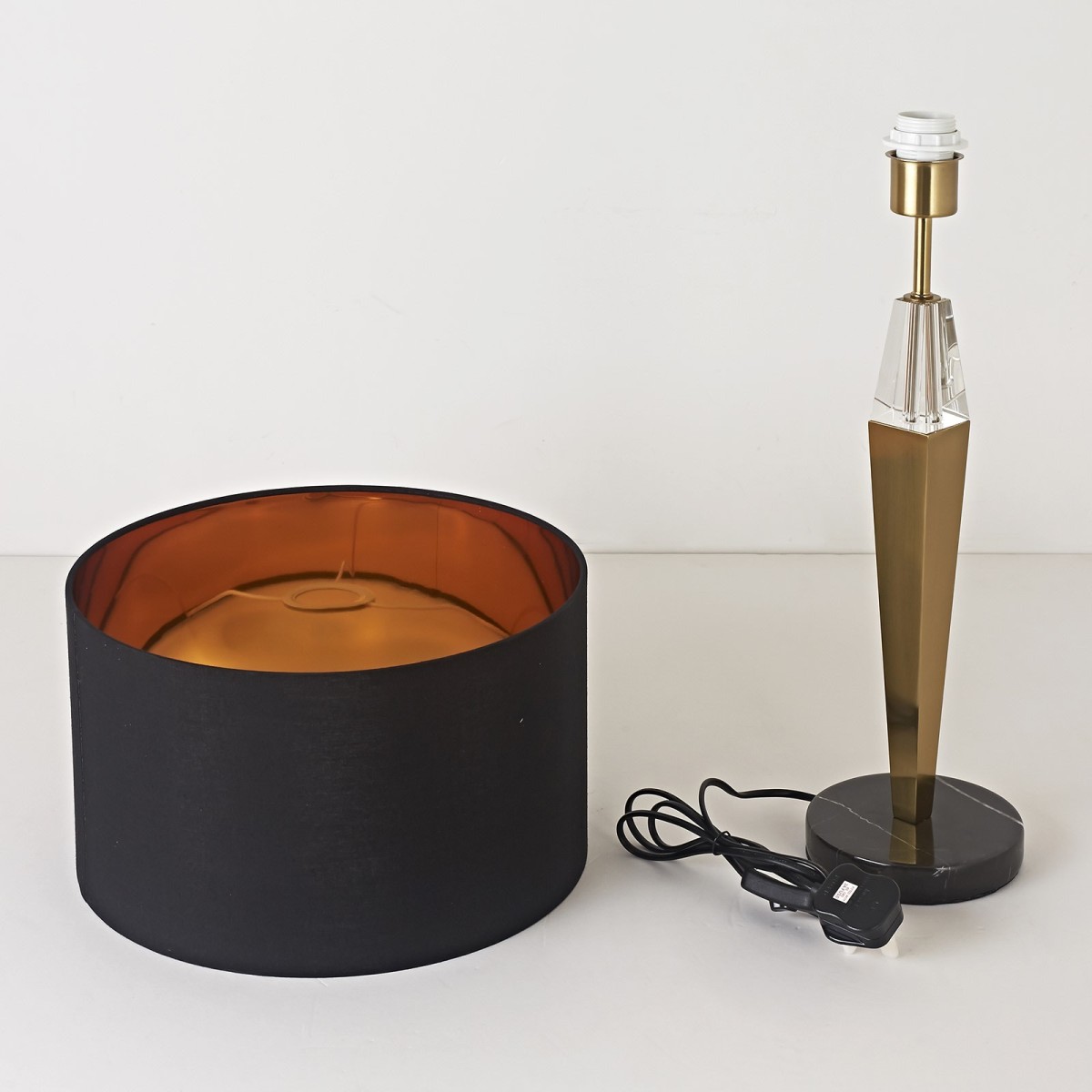 Reference: T108019S LampIntroducing the T108019S Lamp, a striking fusion of modernity and sophistication. With its lustrous gold base and sleek black shade, this lamp epitomizes contemporary elegance. Its minimalist design exudes refinement, making it a standout piece in any space.
