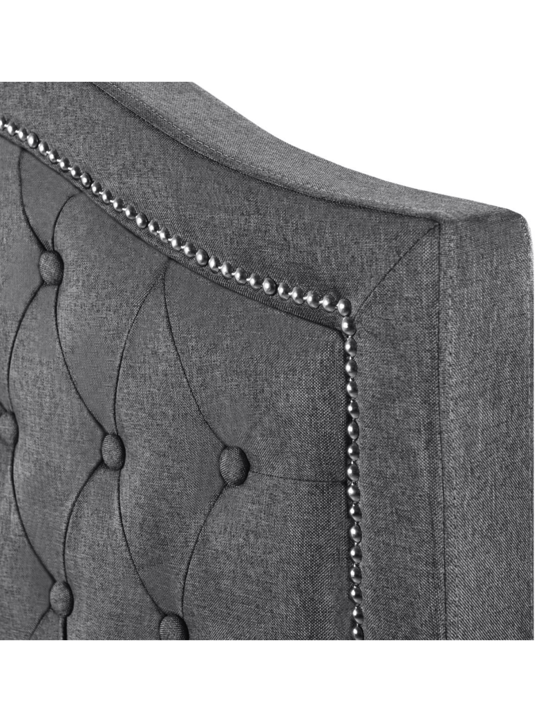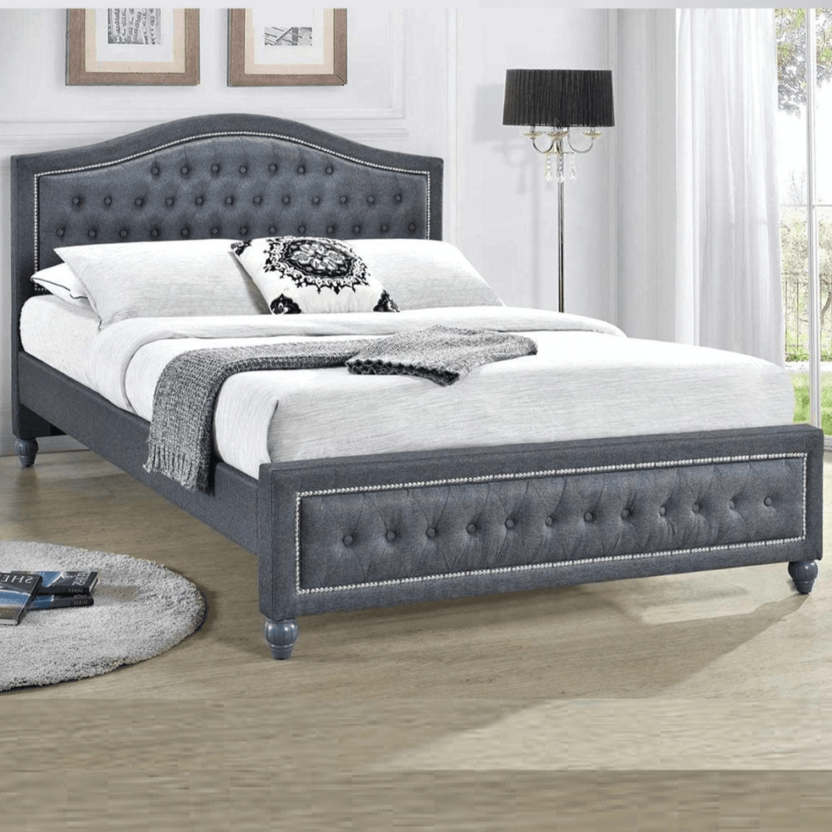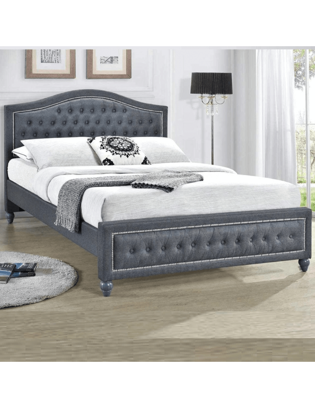 Reference: TAYLORBED-5FTThe Taylor linen bed is a pinnacle of luxury, draped in sumptuous grey fabric that brings both warmth and elegance to your bedroom. This bedframe is a masterpiece of traditional design, showcasing a timeless button-back headboard and footboard with exquisite metallic stud detailing for added sophistication. The sturdy carved wooden feet, painted and intricately designed, provide both style and stability. For added practicality, the Taylor includes under-bed storage space, making it as functional as it is beautiful. Perfect for those seeking classic charm with modern convenience.