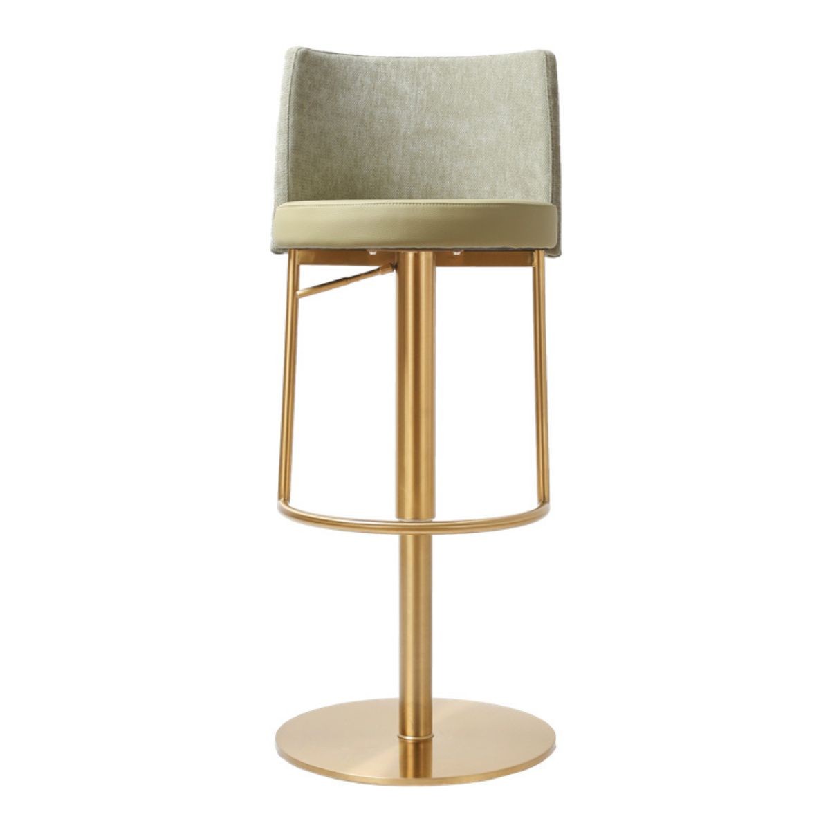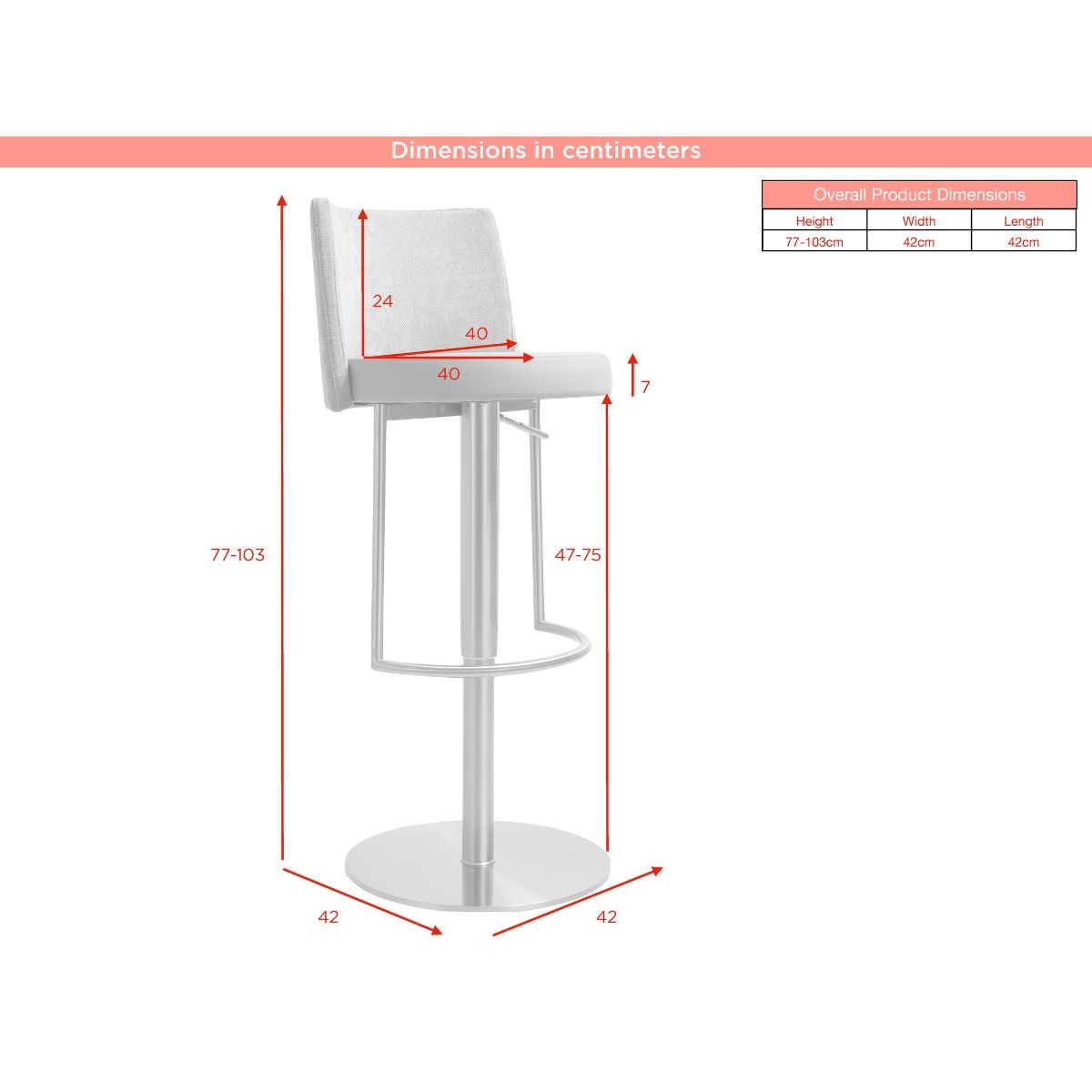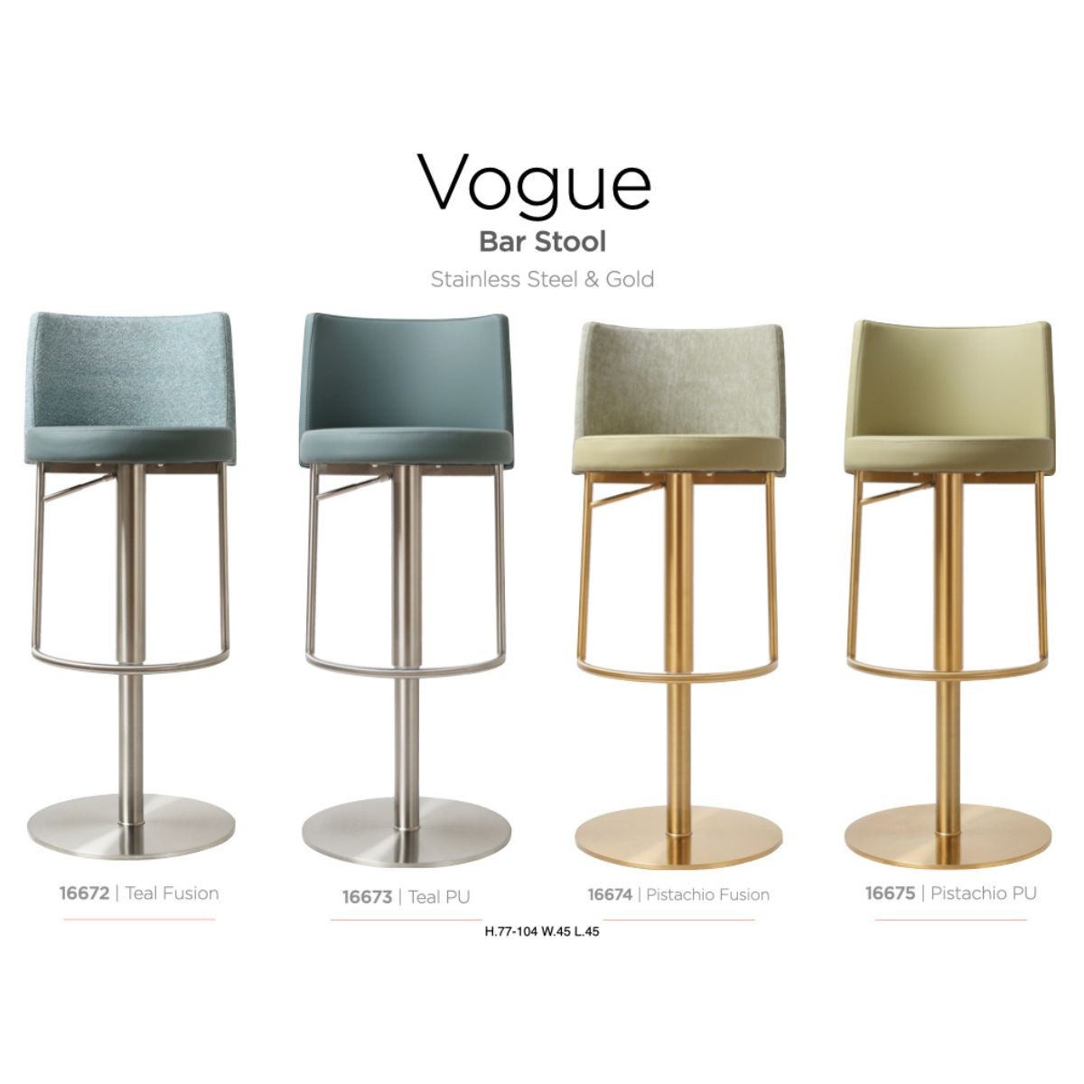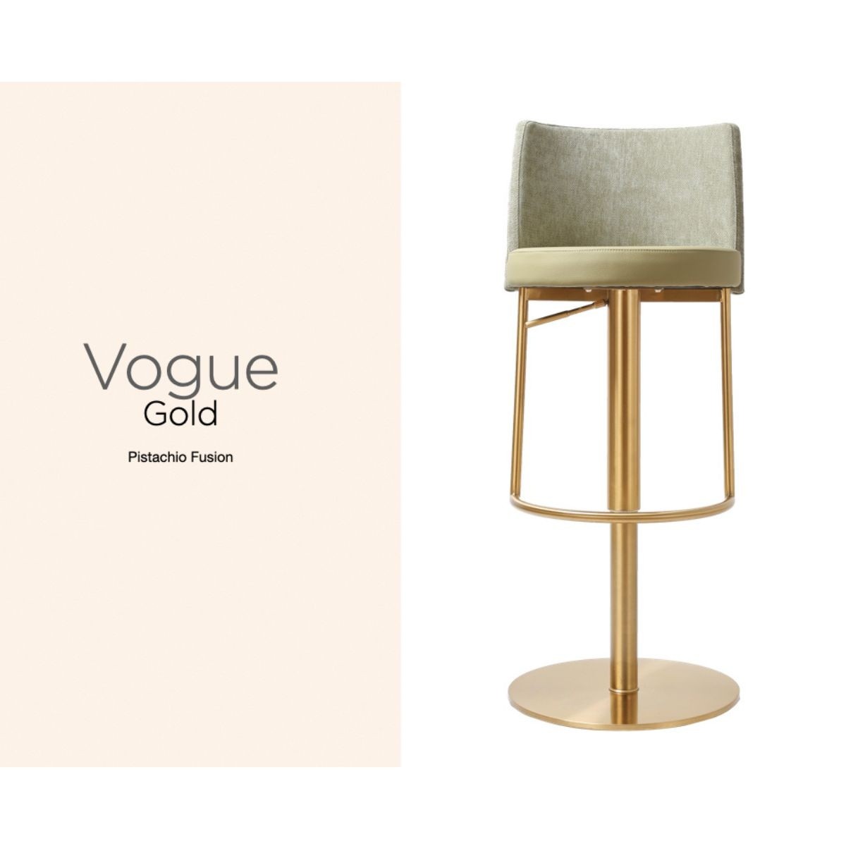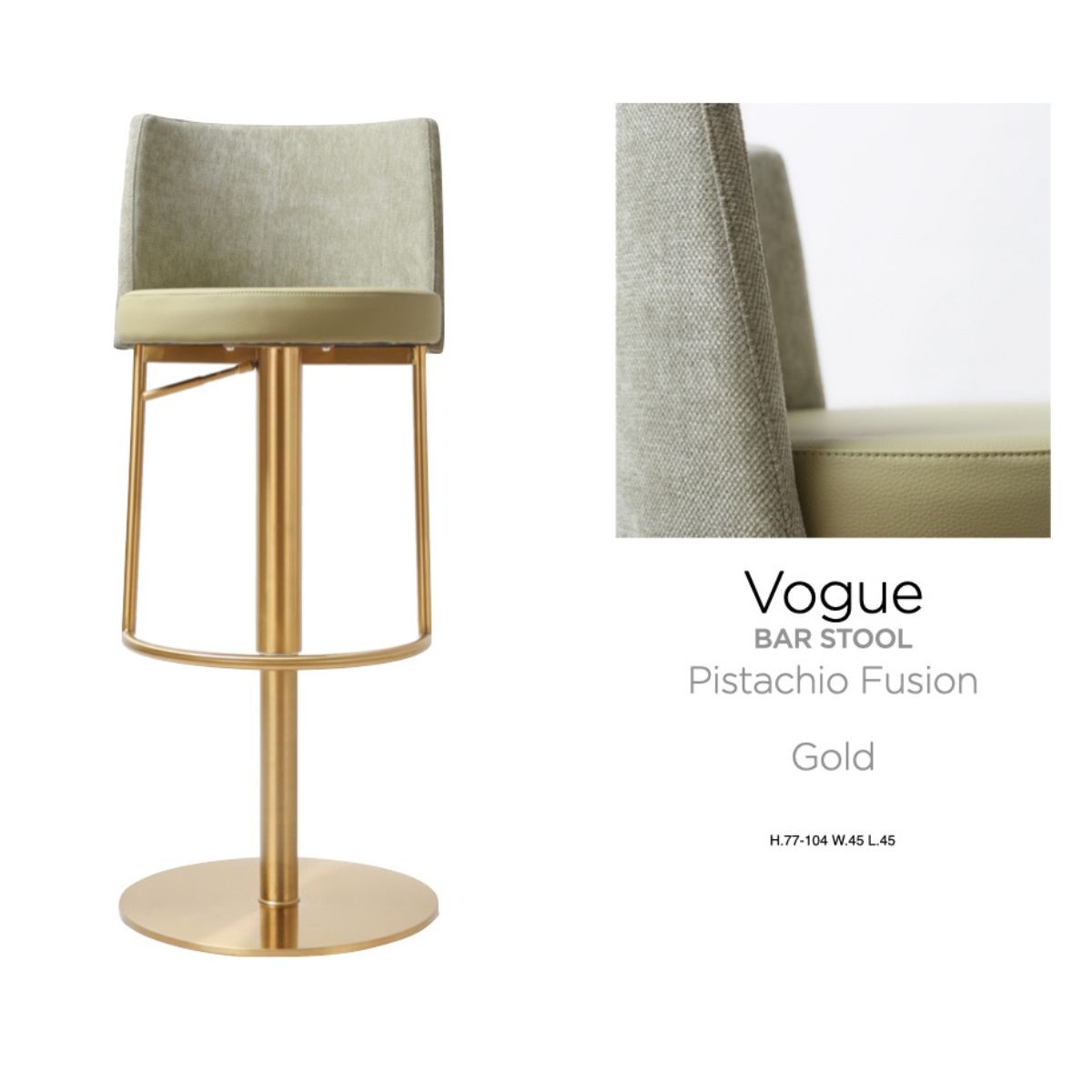 Reference: 16674The Vogue Bar Stool Collection brings contemporary elegance and everyday functionality to your home. With a choice of brushed stainless steel or opulent gold finishes, these stools add a touch of luxury to any space. Upholstered in PU leather or a fusion of PU leather and plush fabric, they balance comfort and style, while gas-lift height adjustment ensures versatility for any setting.