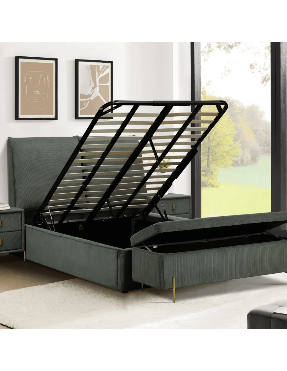 Reference: Waterford 4ft 6 GreenThe Waterford Bedroom Collection brings refined elegance to modern and contemporary interiors with its luxurious green corded fabric finish. Designed to elevate your space with subtle sophistication, each piece in the collection is crafted for both visual appeal and long-lasting quality. The Waterford bedframe serves as a stylish focal point and features a gas-lift mechanism that reveals spacious under-mattress storage — ideal for keeping your bedroom organized without compromising on style. This perfect blend of comfort, functionality, and design makes the Waterford a standout choice for any home.