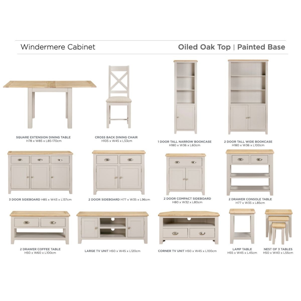 Reference: 17050The Windermere Collection combines traditional charm with modern sophistication. Featuring beautifully oiled oak tops and a soft Oyster Grey painted finish, this range offers timeless elegance with a contemporary twist. The Flip-Top Extension Dining Table serves as the centerpiece, supported by coordinating sideboards and occasional pieces to bring functional style to every room. Perfectly balancing warmth, practicality, and refined design, Windermere is a collection to cherish.