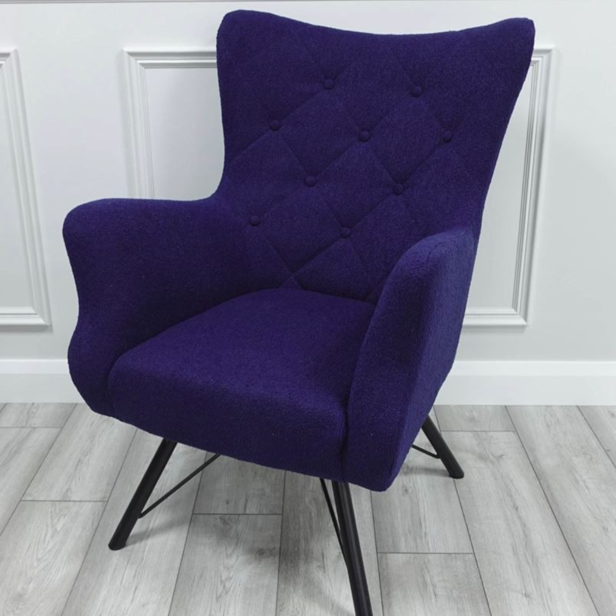 Reference: miloarmchairnavyAdd a touch of modern elegance to your home with the Winslow Accent Chair. Upholstered in a rich luxurious fabric, this stylish chair features a quilted button-back design that adds depth and texture to its sleek silhouette. The sculpted arms and curved backrest offer both comfort and contemporary style, making it the perfect statement piece for any room. Set on angled metal legs, the Winslow chair combines sturdiness with chic design. Whether placed in a living room, bedroom, or reading nook, it promises to elevate your space with its sophisticated charm.